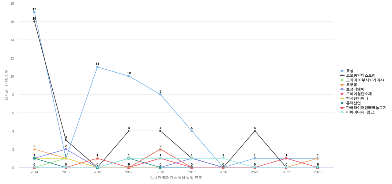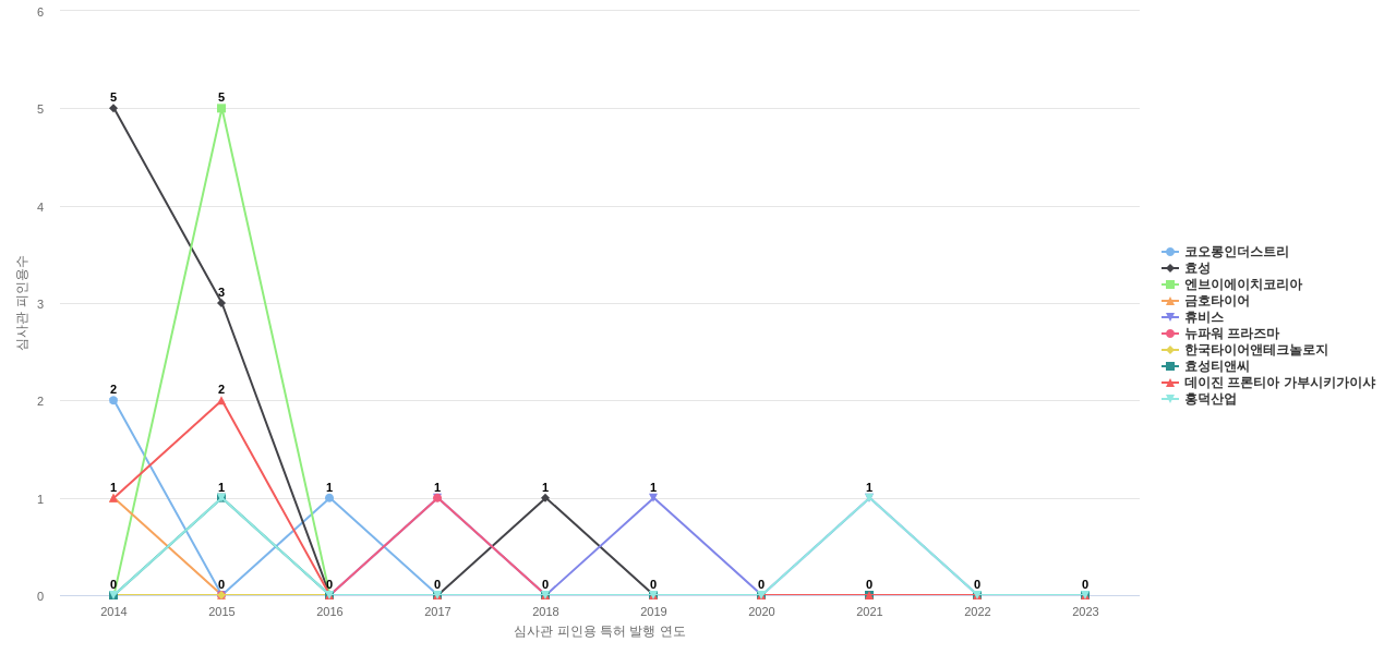 효성의 심사관 피인용수는 28회입니다. 효성의 심사관 피인용수는 최근 11년 이전에 19회, 최근 11년 동안에는 9회로 총 28회를 보이며, 2014년에 5회의 최고값을 보입니다. 그리고, 이 값은 이번 연도인 2024년에는 0회, 1년 전인 2023년에는 0회, 2년 전인 2022년에는 0회를 보입니다.