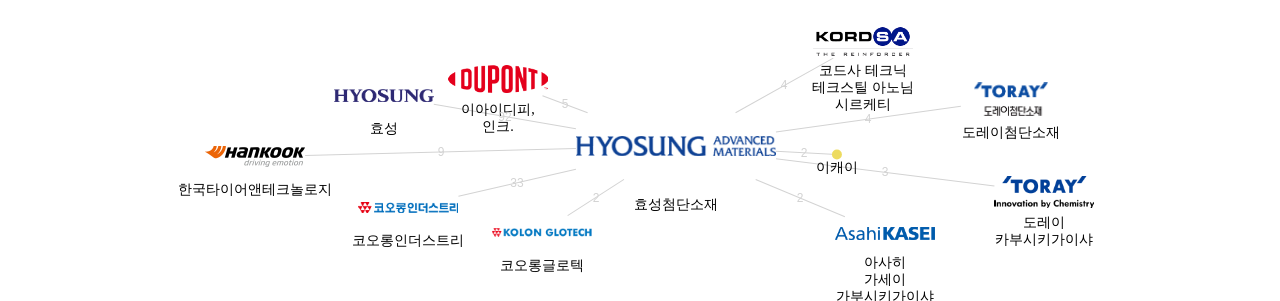 이 기업 보유 선행 특허가 받은 심사관 피인용수가 많은 관련 기업에는 1위 코오롱인더스트리(48회), 2위 효성(28회), 3위 엔브이에이치코리아(6회) 등이 있습니다.