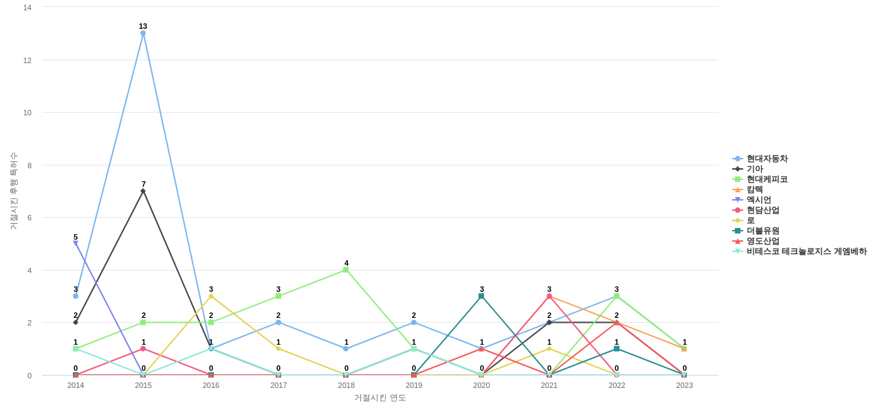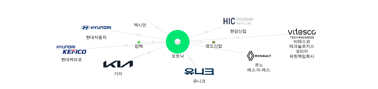 이 기업 보유 선행 특허가 받은 심사관 피인용수가 많은 관련 기업에는 1위 현대자동차(82회), 2위 기아(32회), 3위 현대케피코(17회) 등이 있습니다.