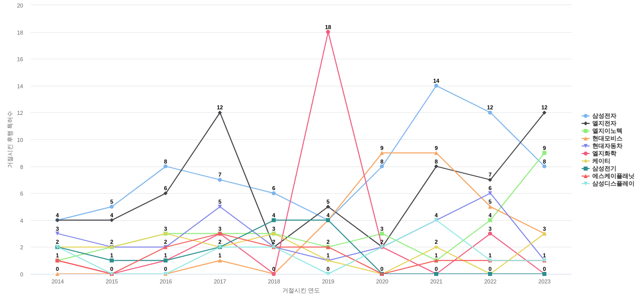 이 기업 보유 선행 특허가 받은 심사관 피인용수가 많은 관련 기업에는 1위 삼성전자(195회), 2위 엘지전자(110회), 3위 삼성전기(68회) 등이 있습니다.