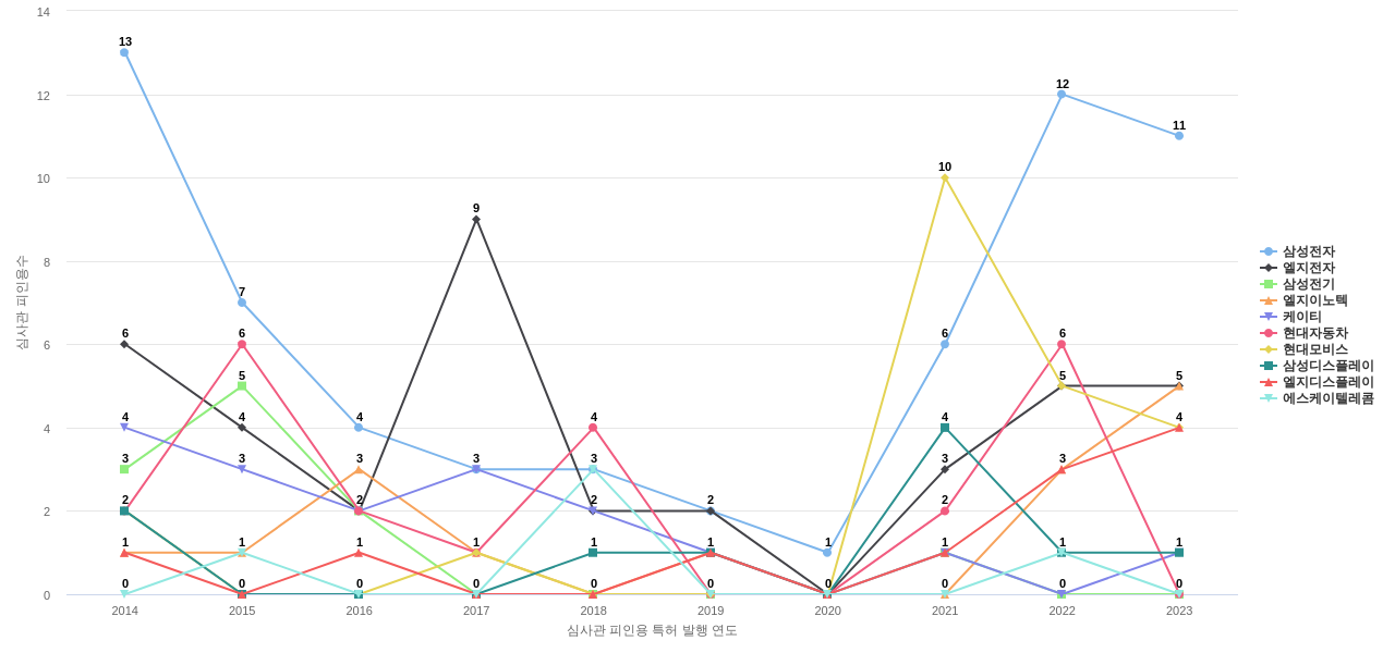 삼성전자의 심사관 피인용수는 195회입니다. 삼성전자의 심사관 피인용수는 11년 이전부터 발생하기 시작하여 2014년에 13회의 최고값을 보입니다. 그리고, 이 값은 이번 연도인 2024년에는 2회, 1년 전인 2023년에는 11회, 2년 전인 2022년에는 12회를 보입니다.