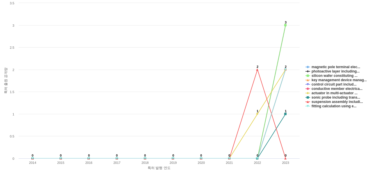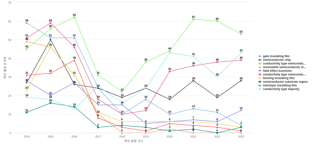 gate insulating film의 공개 특허수는 1,952건입니다. gate insulating film의 공개 특허수는 11년 이전부터 발생하기 시작하여 2014년에 59건의 최고값을 보입니다. 그리고, 이 값은 이번 연도인 2024년에는 5건, 1년 전인 2023년에는 4건, 2년 전인 2022년에는 11건을 보입니다.