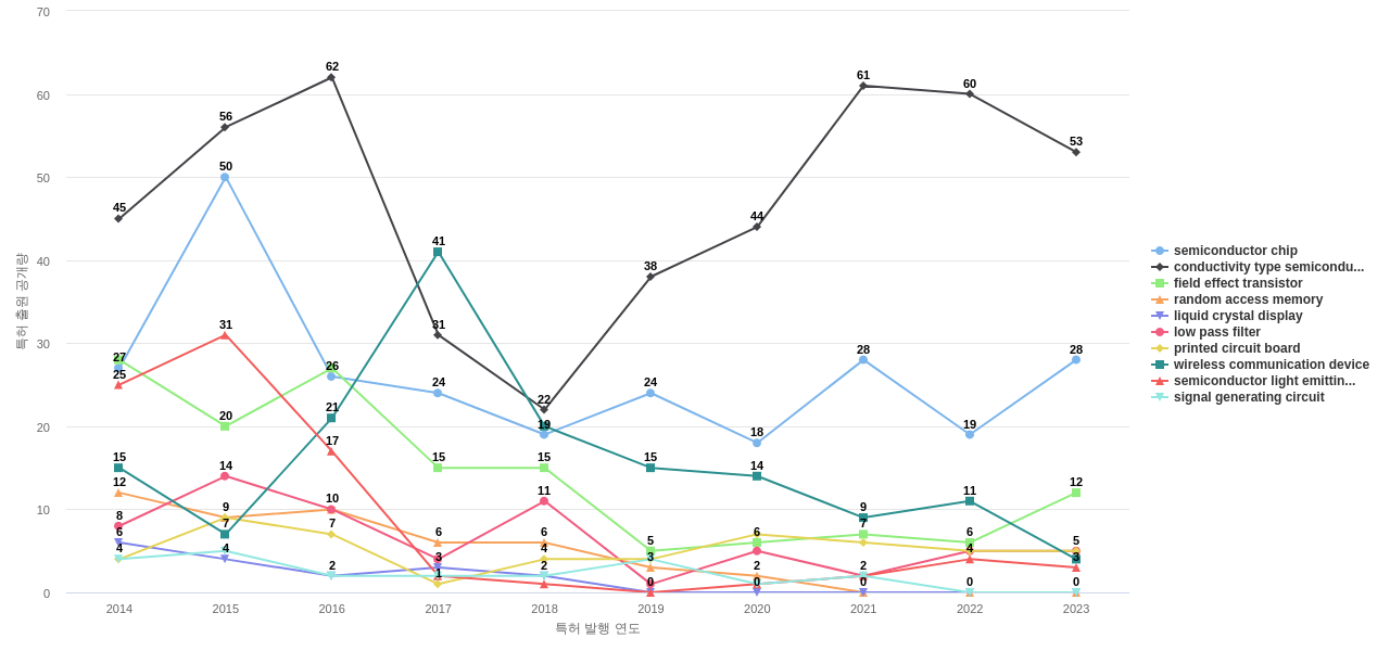 semiconductor chip의 공개 특허수는 1,130건입니다. semiconductor chip의 공개 특허수는 11년 이전부터 발생하기 시작하여 2015년에 50건의 최고값을 보입니다. 그리고, 이 값은 이번 연도인 2024년에는 16건, 1년 전인 2023년에는 28건, 2년 전인 2022년에는 19건을 보입니다.