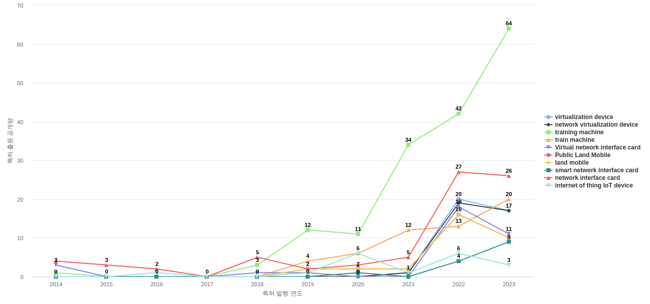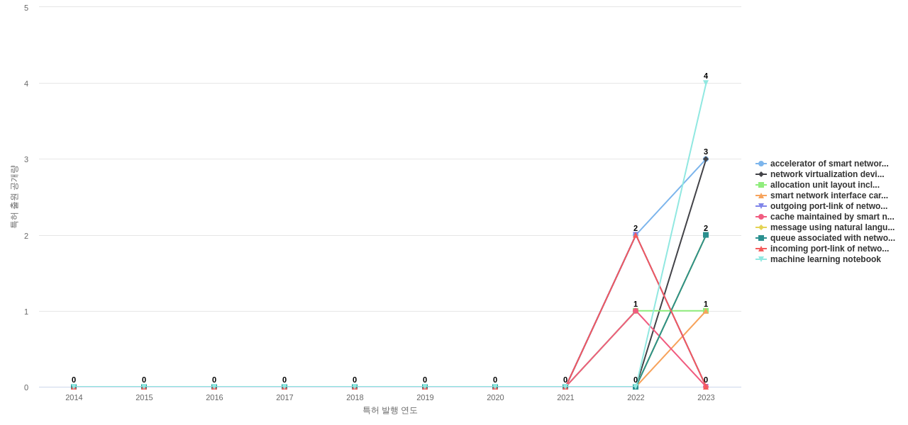 또한 trained machine learning은 공개 특허수(135건), 등록 특허수(59건), 집중률(0.55%), 심사관 피인용수(260회), 해외 특허 패밀리수(해외 Fam.)(142개), network virtualization device는 공개 특허수 점유율(점유율_공개)(96.0%), 심사관 피인용수 점유율(점유율_FC-E)(87.0%), repository function은 매입 특허수(1건)에서 1위 입니다. trained machine learning model은 공개 특허수(127건), 등록 특허수(54건), 집중률(0.52%), 심사관 피인용수(238회), 해외 특허 패밀리수(해외 Fam.)(131개), NF repository function은 공개 특허수 점유율(점유율_공개)(58.9%), 심사관 피인용수 점유율(점유율_FC-E)(32.3%), cloud network는 매입 특허수(1건)에서 2위 입니다. NF Repository는 공개 특허수 점유율(점유율_공개)(58.3%), 심사관 피인용수 점유율(점유율_FC-E)(31.9%), network virtualization은 심사관 피인용수(95회)에서 3위 입니다. NRF은(는) 공개 특허수(66건), 등록 특허수(46건), 집중률(0.27%), 심사관 피인용수 점유율(점유율_FC-E)(5.87%), 해외 특허 패밀리수(해외 Fam.)(97개), virtualization device는 공개 특허수 점유율(점유율_공개)(28.3%)에서 4위 입니다.