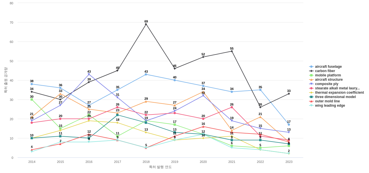 1) [기술 기획 조직]/[IP 조직] 보잉의 특허에 포함된 신규 등장 키워드나 급성장하고 있는 키워드(제품-부품, 소재-물질, 기능-작용, 컨셉 등)를 i) 파악하고, ii) 체계적으로 테크 센싱을 수행하며, iii) 그 결과를 필요 조직에 전파해야 하지 않을까요? 특히, 고객, 주요 기업, 경쟁사, 밸류 체인이나 공급망 구성 기업인 보잉라면 이러한 활동이 더욱 더 중요하지 않을까요?