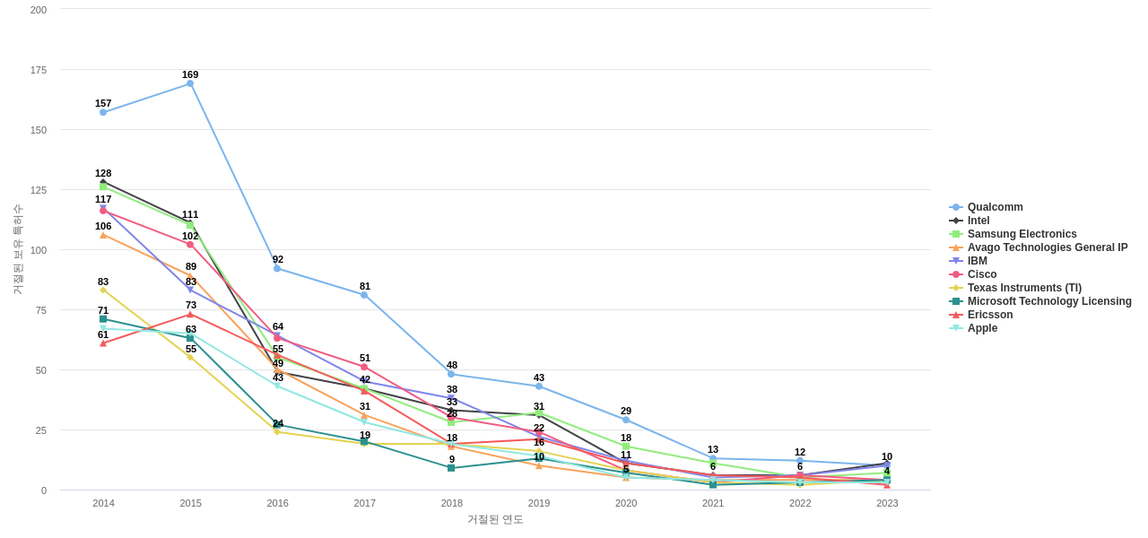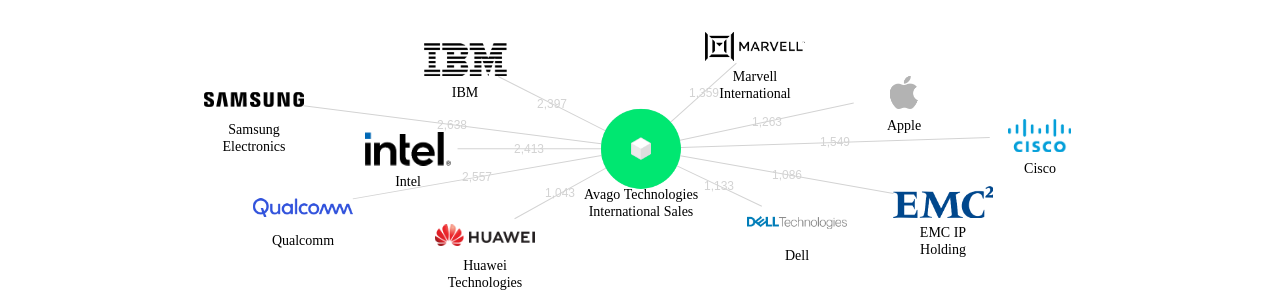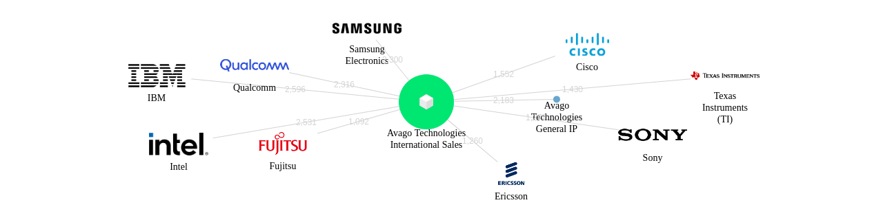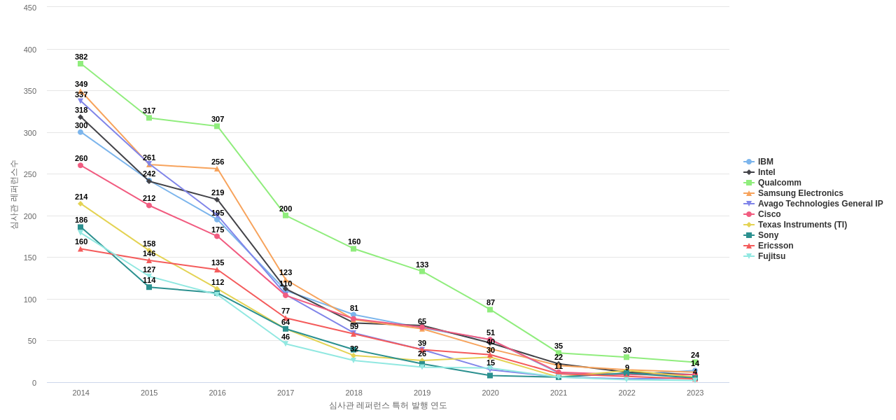 이 기업 보유 선행 특허가 받은 심사관 피인용수가 많은 관련 기업에는 1위 Samsung Electronics(2,638회), 2위 Qualcomm(2,557회), 3위 Intel(2,413회) 등이 있습니다.
