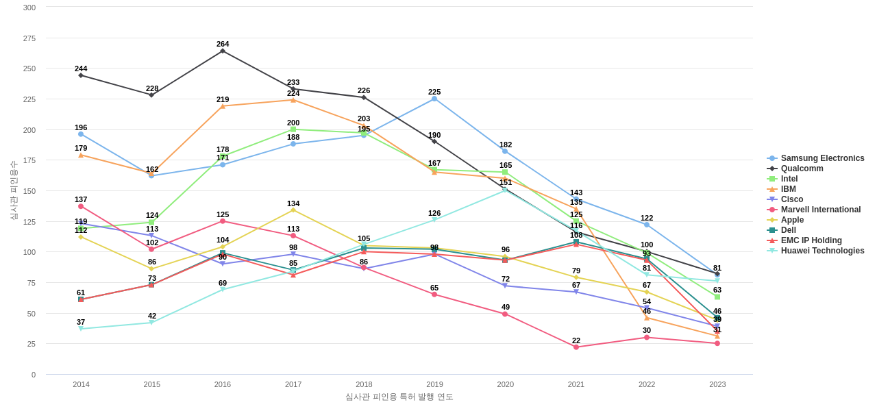 Samsung Electronics의 심사관 피인용수는 2,638회입니다. Samsung Electronics의 심사관 피인용수는 11년 이전부터 발생하기 시작하여 2019년에 225회의 최고값을 보입니다. 그리고, 이 값은 이번 연도인 2024년에는 57회, 1년 전인 2023년에는 81회, 2년 전인 2022년에는 122회를 보입니다.