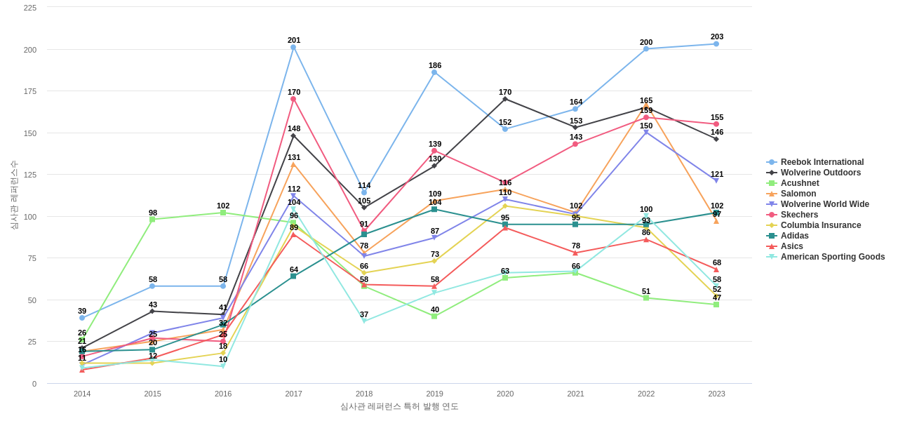 이 기업 보유 선행 특허가 받은 심사관 피인용수가 많은 관련 기업에는 1위 Samsung Electronics(474회), 2위 Apple(438회), 3위 Adidas(422회) 등이 있습니다.