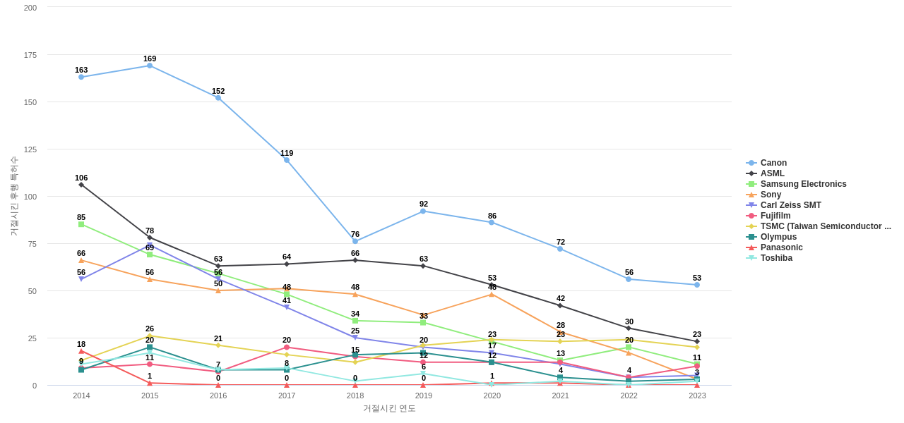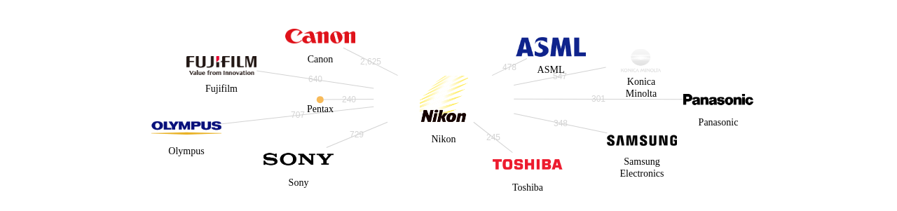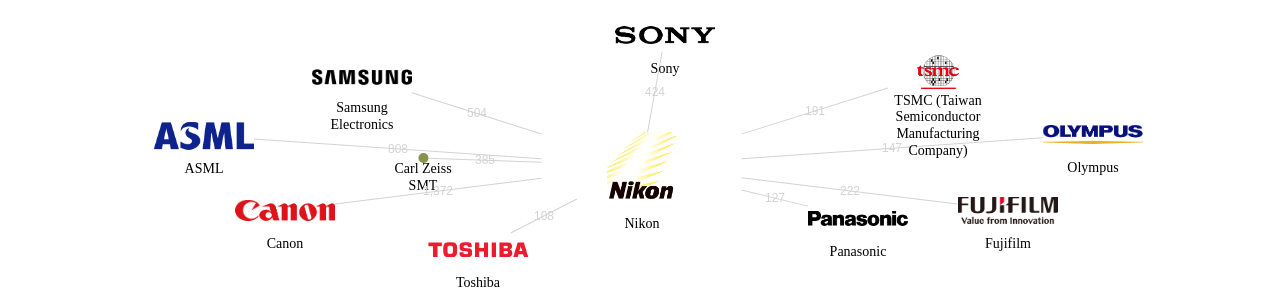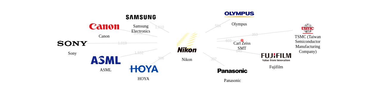 이 기업 보유 선행 특허가 받은 심사관 피인용수가 많은 관련 기업에는 1위 Canon(3,999회), 2위 ASML(1,552회), 3위 Sony(1,019회) 등이 있습니다.
