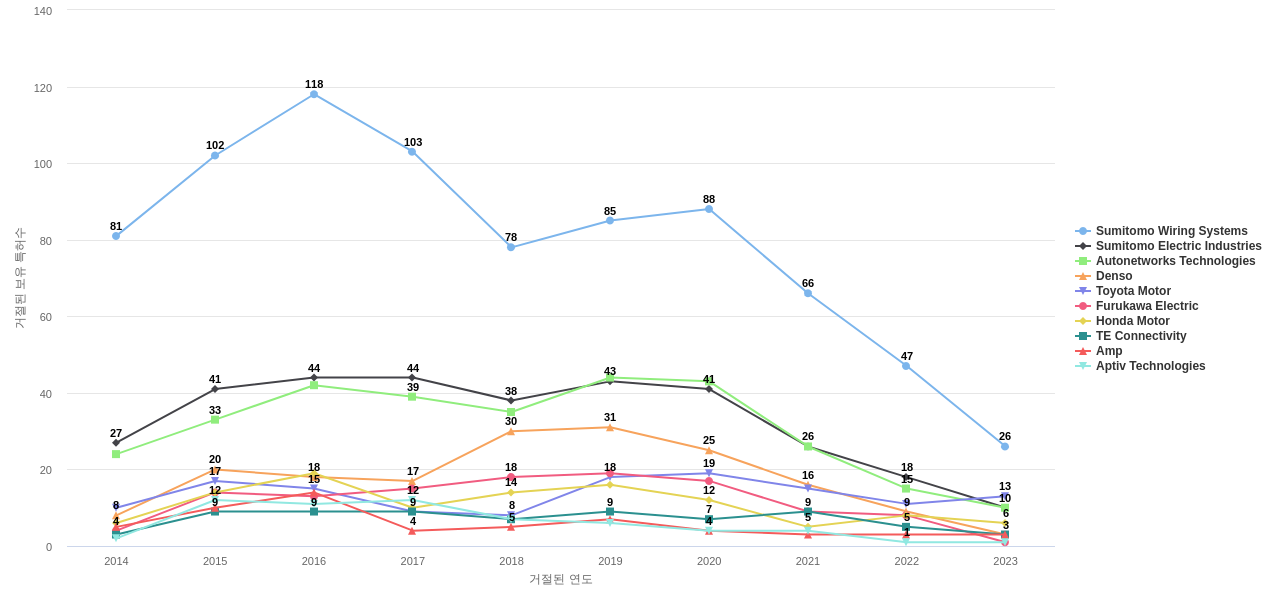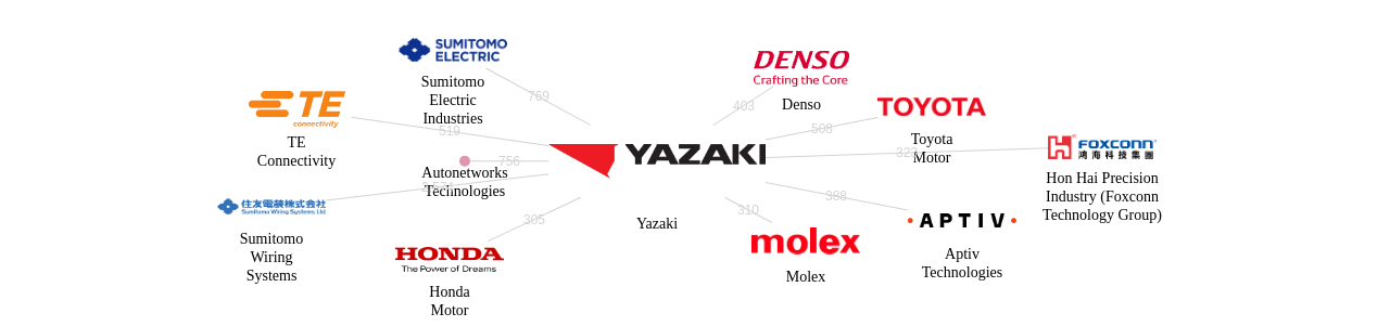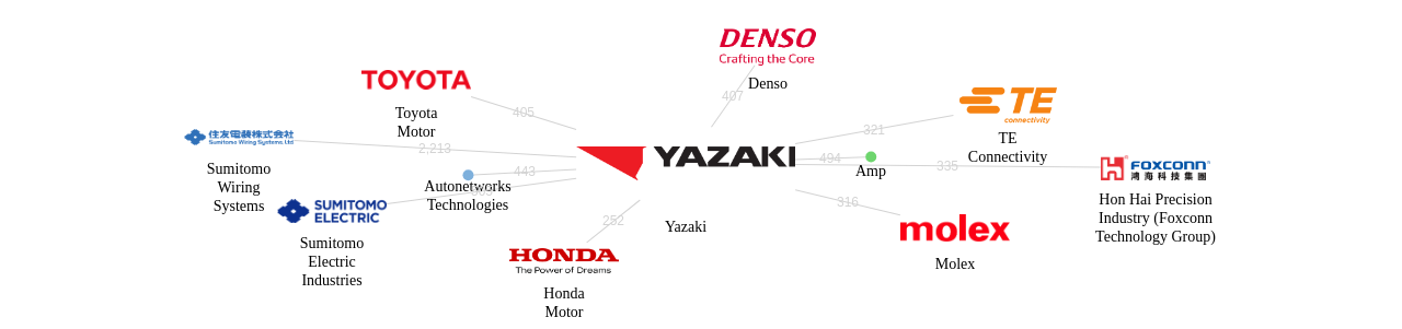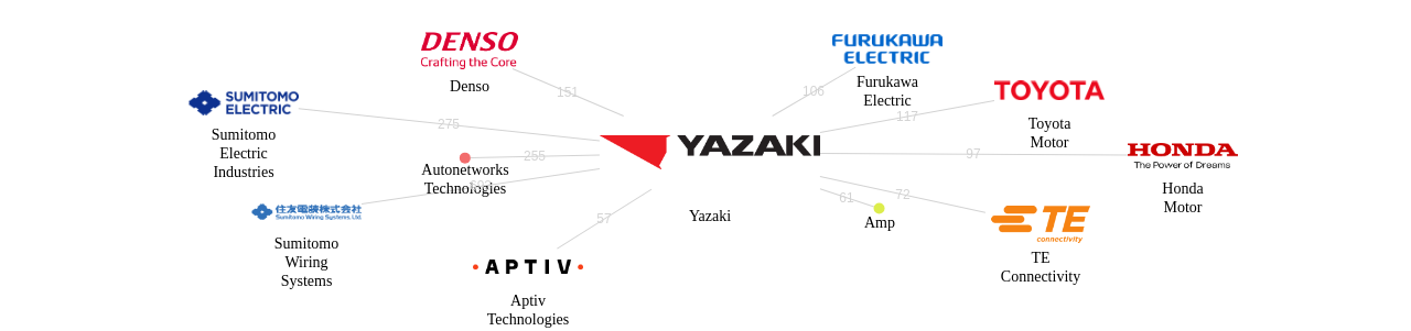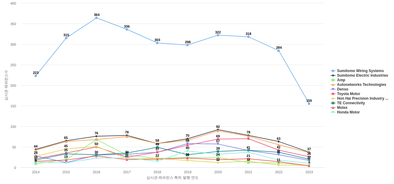 이 기업 보유 후행 특허가 참조하는 심사관 레퍼런스수가 많은 관련 기업에는 1위 Sumitomo Wiring Systems(2,213회), 2위 Sumitomo Electric Industries(505회), 3위 Amp(494회) 등이 있습니다.