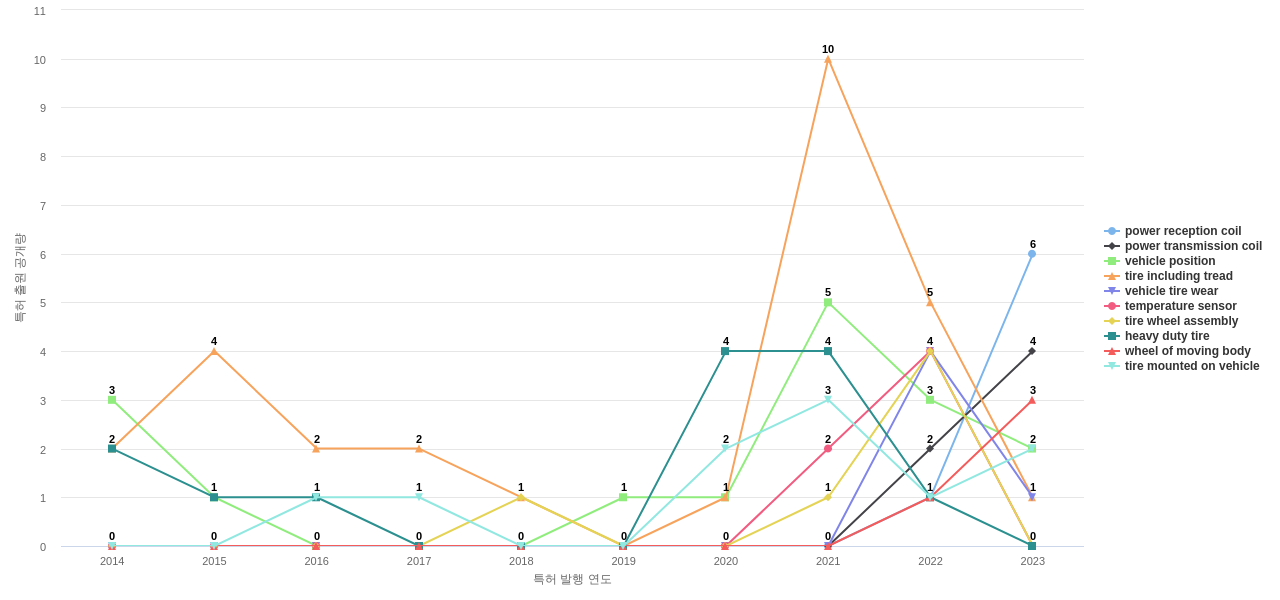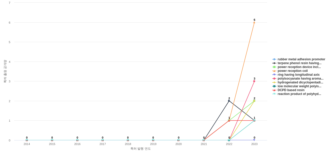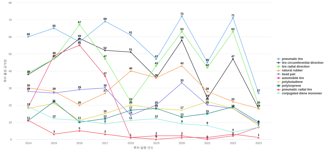 또한 contact with road는 공개 특허수(77건), 등록 특허수(42건), 집중률(0.97%), 심사관 피인용수(127회), 해외 특허 패밀리수(해외 Fam.)(406개), reinforcing carbon black filler는 공개 특허수 점유율(점유율_공개)(100.0%), 심사관 피인용수 점유율(점유율_FC-E)(100.0%)에서 1위 입니다. contact with road surface는 공개 특허수(72건), 등록 특허수(38건), 집중률(0.9%), 심사관 피인용수(113회), 해외 특허 패밀리수(해외 Fam.)(379개), prescribed internal pressure는 공개 특허수 점유율(점유율_공개)(87.5%), 심사관 피인용수 점유율(점유율_FC-E)(75.0%)에서 2위 입니다. hydrocarbon resin은 공개 특허수(46건), 등록 특허수(22건), 집중률(0.58%), 심사관 피인용수(80회), 해외 특허 패밀리수(해외 Fam.)(177개), cis bond content는 공개 특허수 점유율(점유율_공개)(46.3%), 심사관 피인용수 점유율(점유율_FC-E)(7.55%)에서 3위 입니다. cis bond는 공개 특허수 점유율(점유율_공개)(29.9%), 심사관 피인용수 점유율(점유율_FC-E)(7.14%)에서 4위 입니다. reinforcing silica filler는 공개 특허수(32건), 등록 특허수(12건), 공개 특허수 점유율(점유율_공개)(21.3%), 집중률(0.4%), 심사관 피인용수(19회), ring support structure는 해외 특허 패밀리수(해외 Fam.)(79개)에서 5위 입니다.