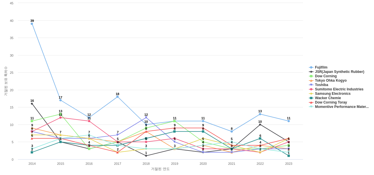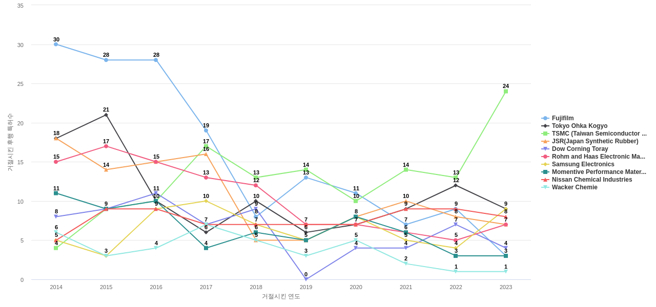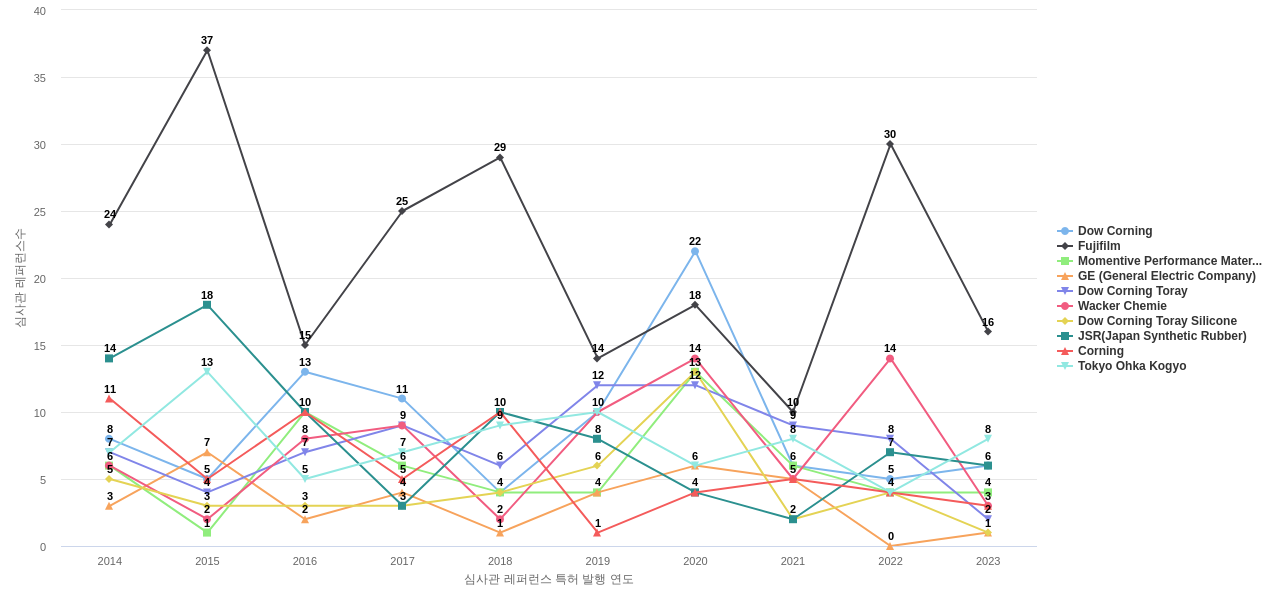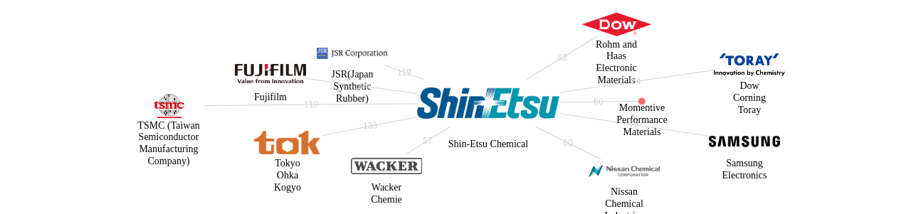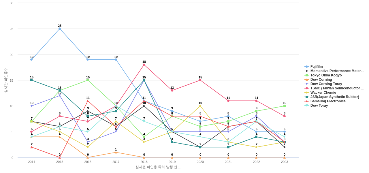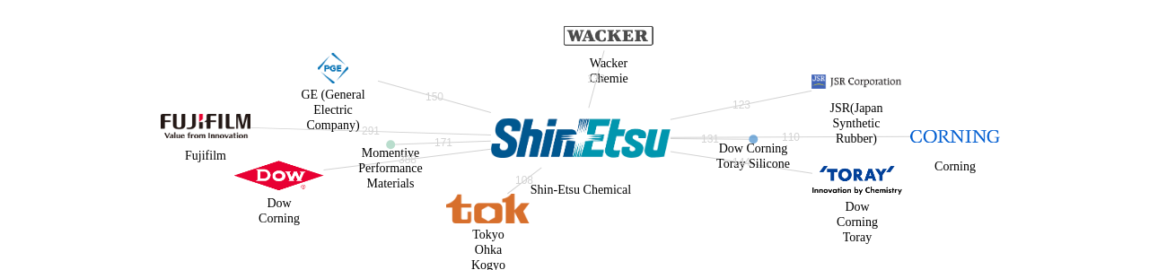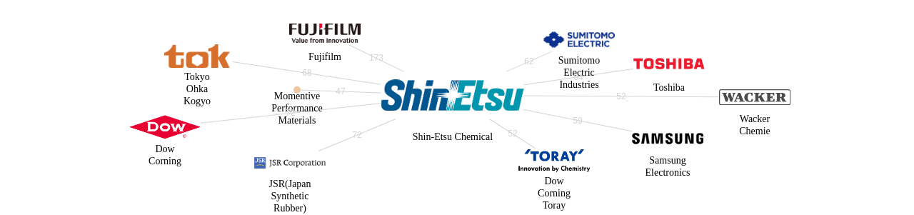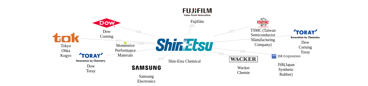 이 기업 보유 선행 특허가 받은 심사관 피인용수가 많은 관련 기업에는 1위 Fujifilm(255회), 2위 Momentive Performance Materials(215회), 3위 Tokyo Ohka Kogyo(167회) 등이 있습니다.