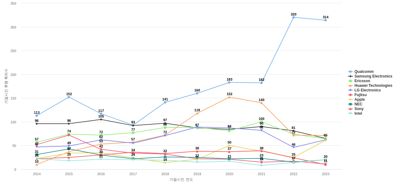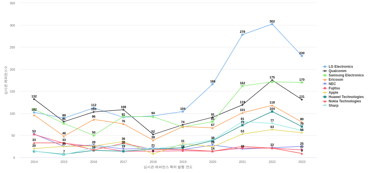 Qualcomm의 심사관 피인용수는 2,318회입니다. Qualcomm의 심사관 피인용수는 11년 이전부터 발생하기 시작하여 2021년에 217회, 2022년에 247회, 지난 해인 2023년에 344회의 최고값을 보입니다.