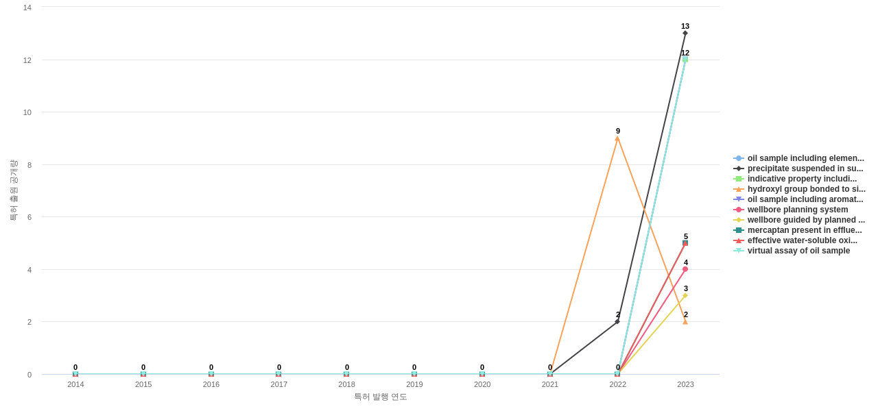 lost circulation material의 공개 특허수의 2014년부터 2023년까지, 지난 9년간 연평균 성장률은 0.31%로, 완만하게 증가하고 있습니다.