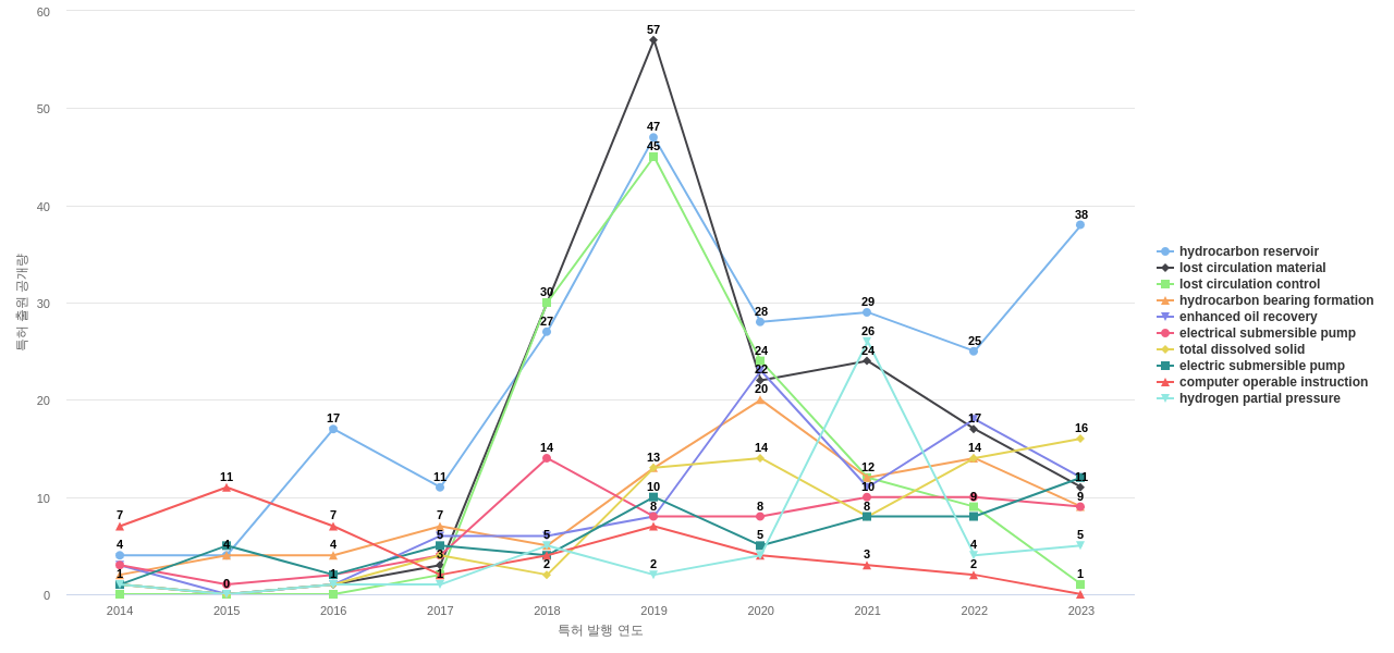 공개 특허수가 많은 특화성 높은 키워드에는 1위 hydrocarbon reservoir, 2위 lost circulation material, 3위 lost circulation control 등이 있습니다.