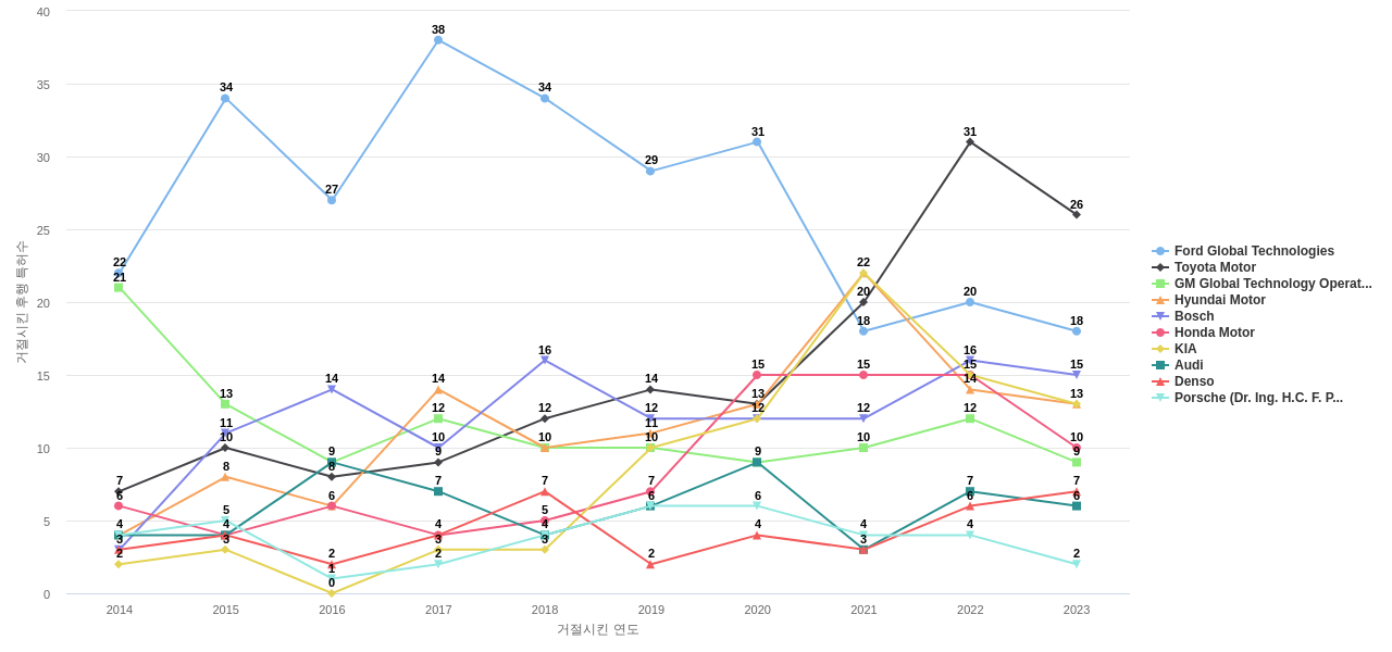 이 기업 보유 후행 특허가 참조하는 심사관 레퍼런스수가 많은 관련 기업에는 1위 Honda Motor(1,098회), 2위 Toyota Motor(1,028회), 3위 Ford Global Technologies(953회) 등이 있습니다.