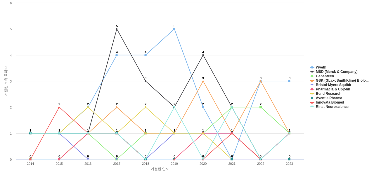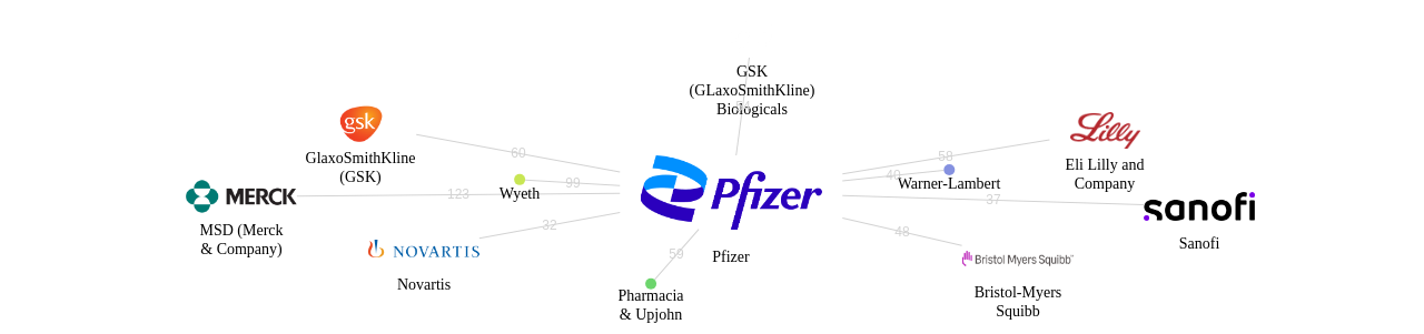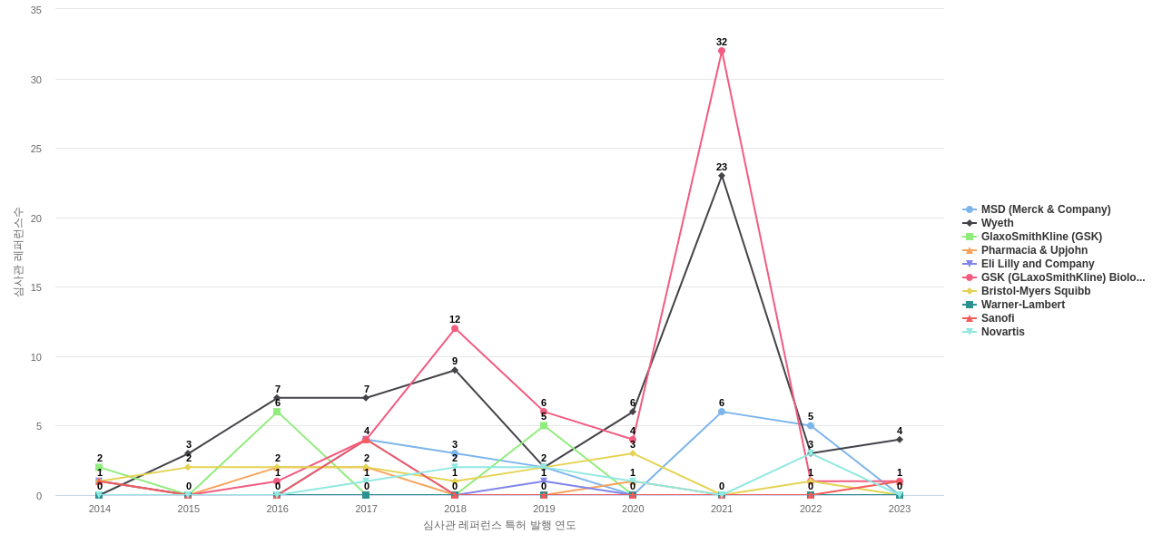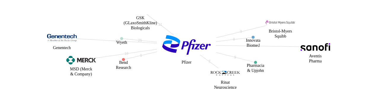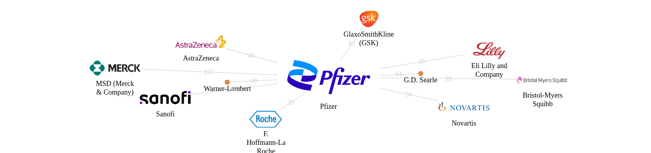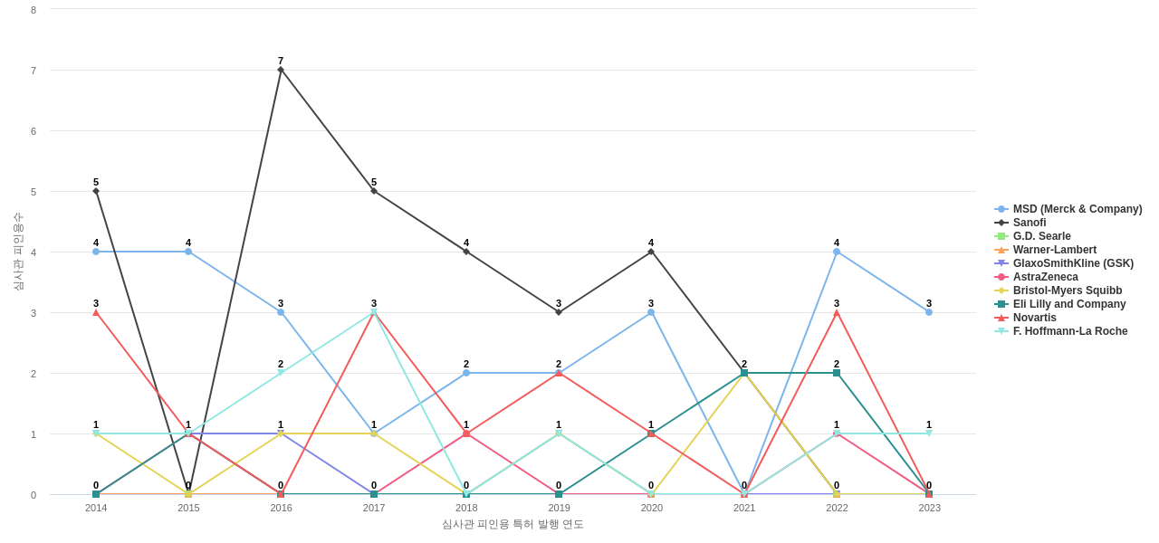 이 기업 보유 선행 특허가 받은 심사관 피인용수가 많은 관련 기업에는 1위 MSD (Merck & Company)(137회), 2위 Sanofi(62회), 3위 G.D. Searle(54회) 등이 있습니다.