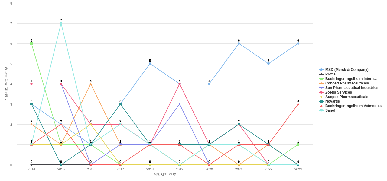 Sanofi의 심사관 피인용수는 62회입니다. Sanofi의 심사관 피인용수는 최근 11년 이전에 32회, 최근 11년 동안에는 30회로 총 62회를 보이며, 2016년에 7회의 최고값을 보입니다. 한편, 이 값은 2022년 이래로 발생하지 않고 있습니다.