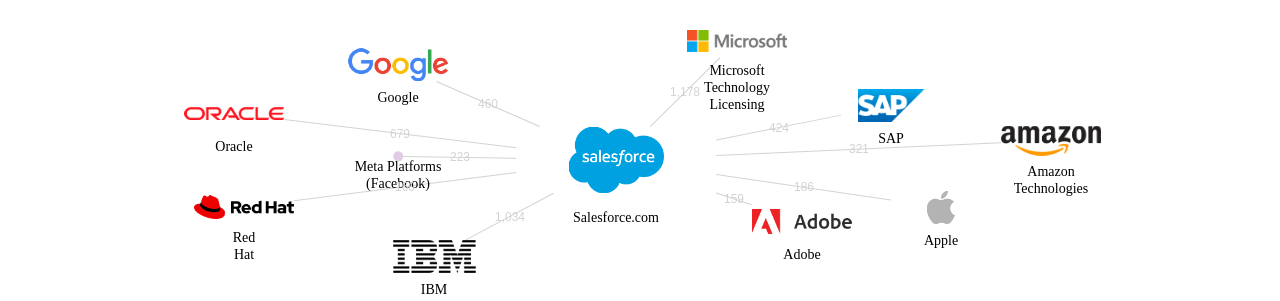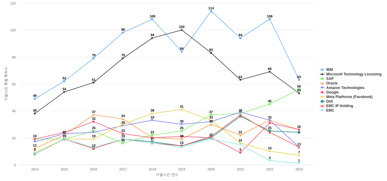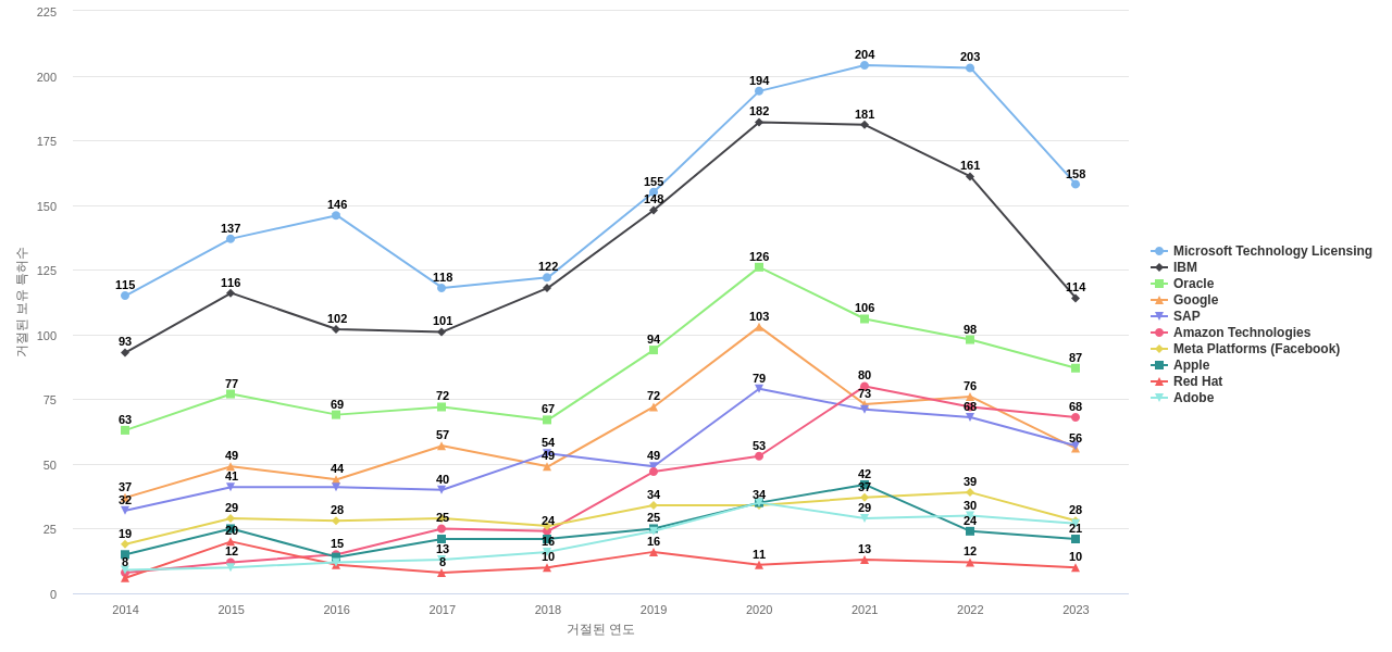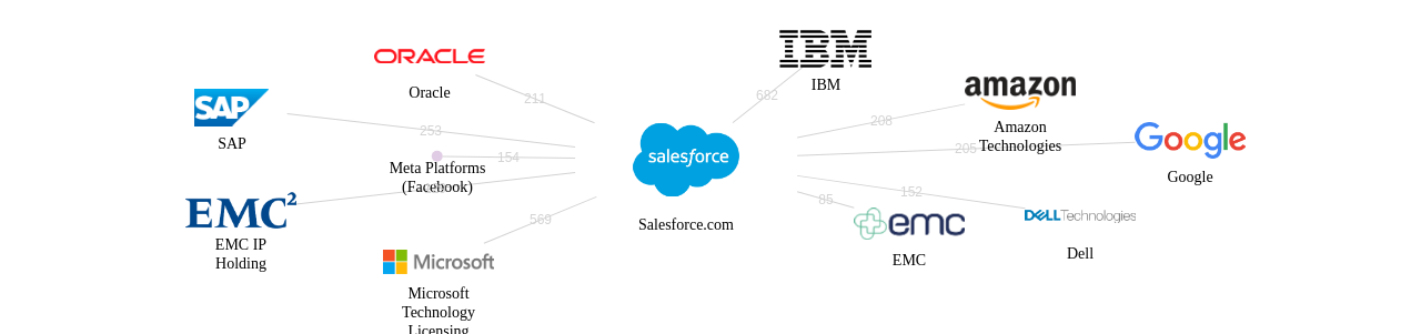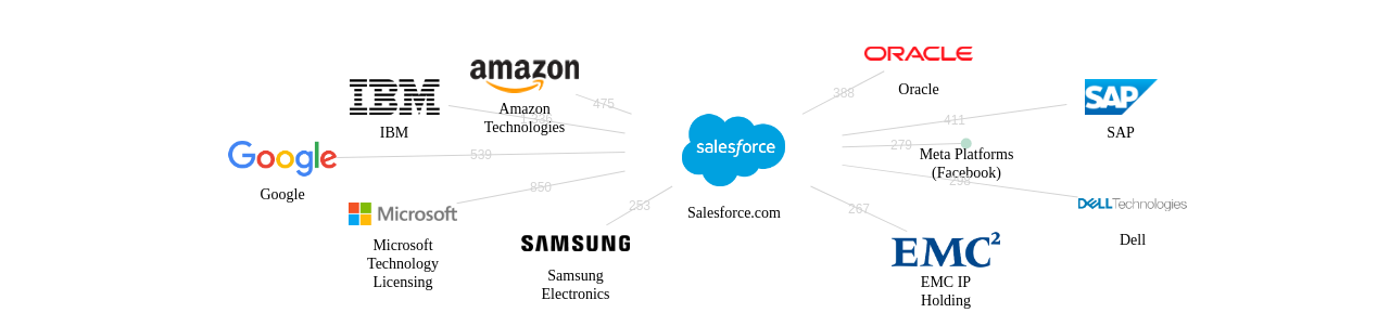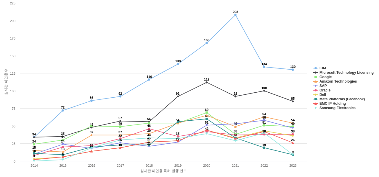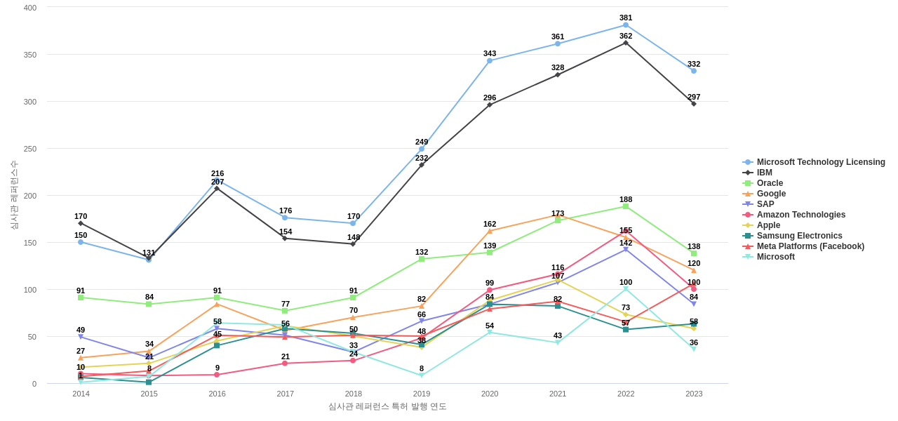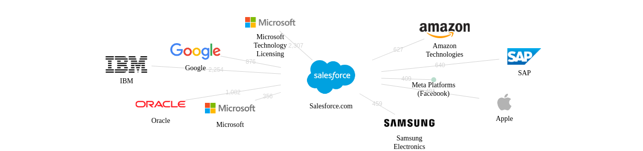 이 기업 보유 후행 특허가 참조하는 심사관 레퍼런스수가 많은 관련 기업에는 1위 Microsoft Technology Licensing(2,307회), 2위 IBM(2,254회), 3위 Oracle(1,082회) 등이 있습니다.