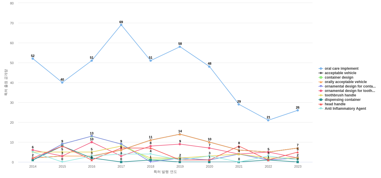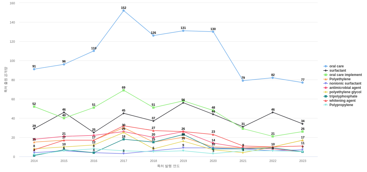 oral care의 공개 특허수는 1,510건입니다. oral care의 공개 특허수는 11년 이전부터 발생하기 시작하여 2017년에 152건의 최고값을 보입니다. 그리고, 이 값은 이번 연도인 2024년에는 62건, 1년 전인 2023년에는 77건, 2년 전인 2022년에는 82건을 보입니다.