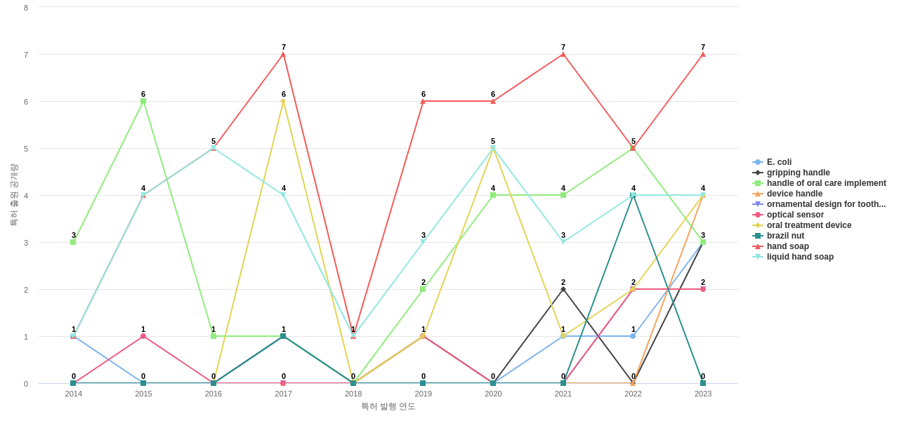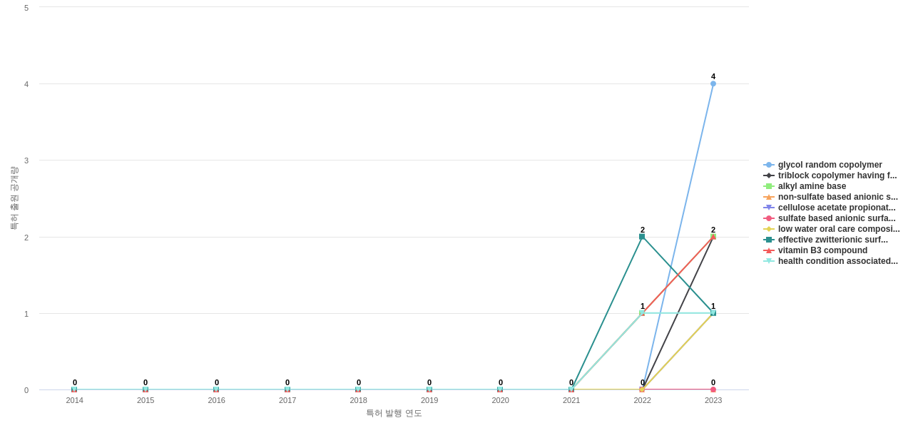 공개 특허수가 많은 특화성 높은 키워드에는 1위 oral care, 2위 surfactant, 3위 oral care implement 등이 있습니다.