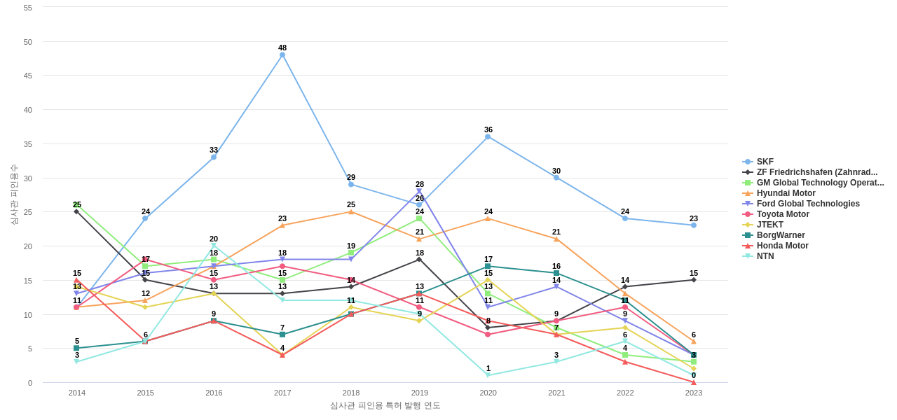SKF의 심사관 피인용수는 317회입니다. SKF의 심사관 피인용수는 11년 이전부터 발생하기 시작하여 2017년에 48회의 최고값을 보입니다. 그리고, 이 값은 이번 연도인 2024년에는 11회, 1년 전인 2023년에는 23회, 2년 전인 2022년에는 24회를 보입니다.