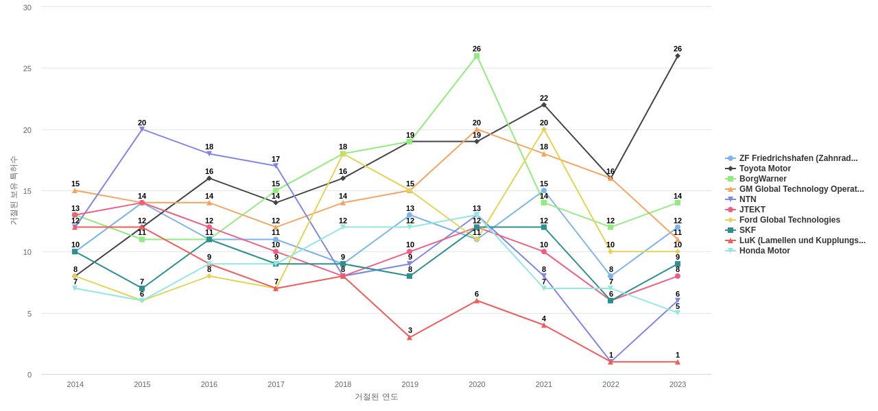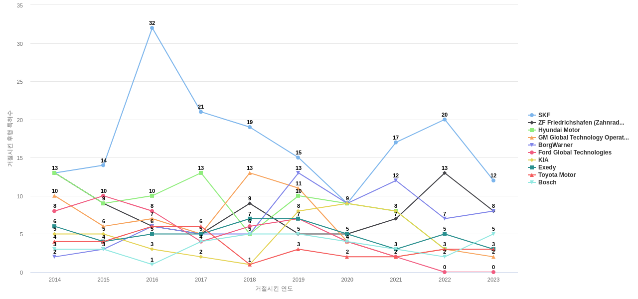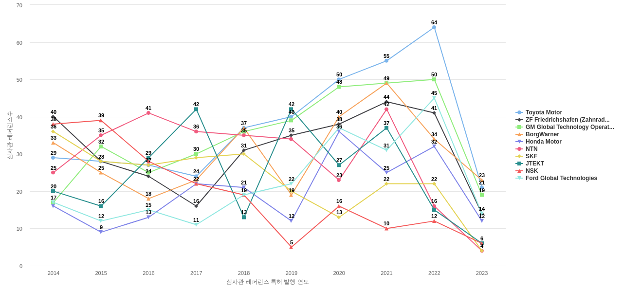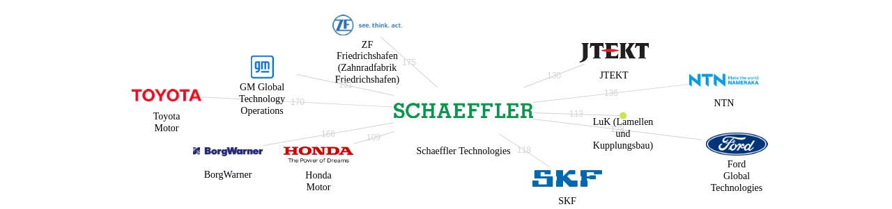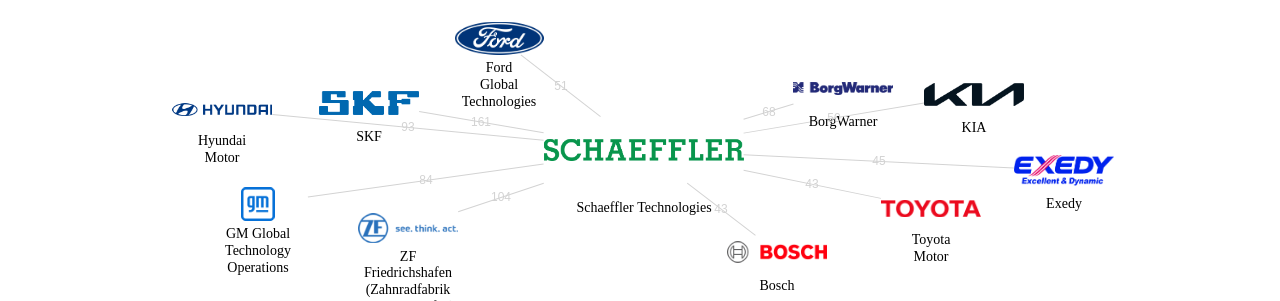 이 기업 보유 선행 특허가 받은 심사관 피인용수가 많은 관련 기업에는 1위 SKF(317회), 2위 ZF Friedrichshafen (Zahnradfabrik Friedrichshafen)(263회), 3위 GM Global Technology Operations(236회) 등이 있습니다.
