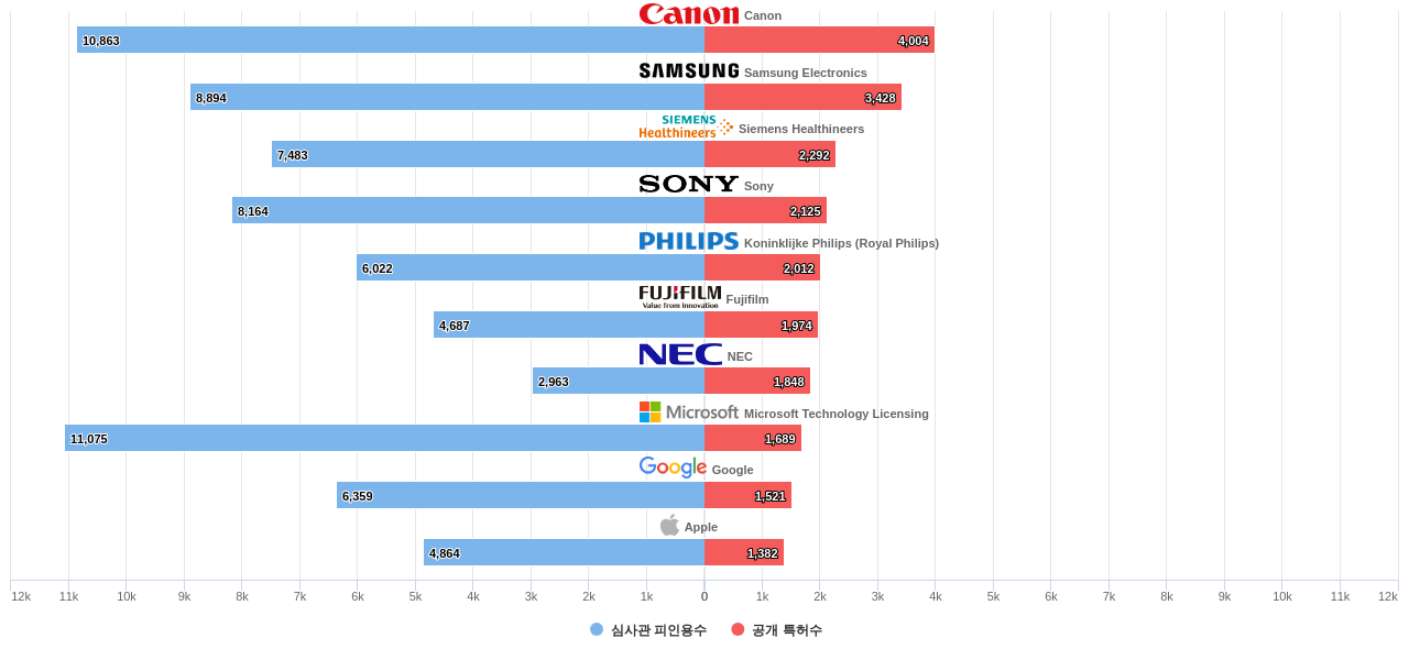 또한 Canon은 공개 특허수(4,004건), 등록 특허수(2,951건), 공개 특허수 점유율(점유율_공개)(3.06%), Siemens Healthineers는 집중률(16.7%), Google은 매입 특허수(237건), NEC은 소송 특허수(4건), Microsoft Technology Licensing은 심사관 피인용수(11,075회), 심사관 피인용수 점유율(점유율_FC-E)(5.45%), Koninklijke Philips (Royal Philips)는 해외 특허 패밀리수(해외 Fam.)(9,319개)에서 1위 입니다. Samsung Electronics는 공개 특허수(3,428건), 등록 특허수(2,366건), 공개 특허수 점유율(점유율_공개)(2.62%), 소송 특허수(2건), 해외 특허 패밀리수(해외 Fam.)(7,143개), Apple은 매입 특허수(177건)에서 2위 입니다. Fujifilm은 집중률(4.75%), 소송 특허수(1건)에서 3위 입니다. Sony는 공개 특허수(2,125건), 등록 특허수(1,799건), 공개 특허수 점유율(점유율_공개)(1.62%), 심사관 피인용수(8,164회), 심사관 피인용수 점유율(점유율_FC-E)(4.02%), 해외 특허 패밀리수(해외 Fam.)(5,855개)에서 4위 입니다.