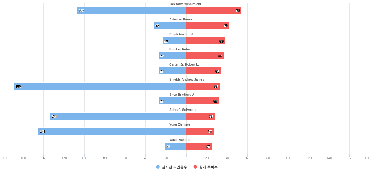 또한 Tanizawa Yoshimichi는 발명 특허수(공개 특허수)(54건), 공개 특허수 점유율(점유율_공개)(3.15%), 해외 특허 패밀리수(해외 Fam.)(99개), Arbajian Pierre은 등록 특허수(39건), 집중률(93.3%), Shields Andrew James는 심사관 피인용수(169회), 심사관 피인용수 점유율(점유율_FC-E)(5.02%)에서 1위 입니다. Carter, Jr. Robert L.은(는) 집중률(91.9%), Yuan Zhiliang는 심사관 피인용수(145회), 심사관 피인용수 점유율(점유율_FC-E)(4.31%)에서 2위 입니다. Stapleton Jeff J.은(는) 발명 특허수(공개 특허수)(38건), 등록 특허수(34건), 공개 특허수 점유율(점유율_공개)(2.21%), Shea Bradford A.은(는) 집중률(91.4%), Ashrafi, Solyman은 심사관 피인용수(134회), 심사관 피인용수 점유율(점유율_FC-E)(3.98%)에서 3위 입니다. Bordow Peter는 발명 특허수(공개 특허수)(37건), 등록 특허수(33건), 공개 특허수 점유율(점유율_공개)(2.16%), 집중률(75.5%)에서 4위 입니다.