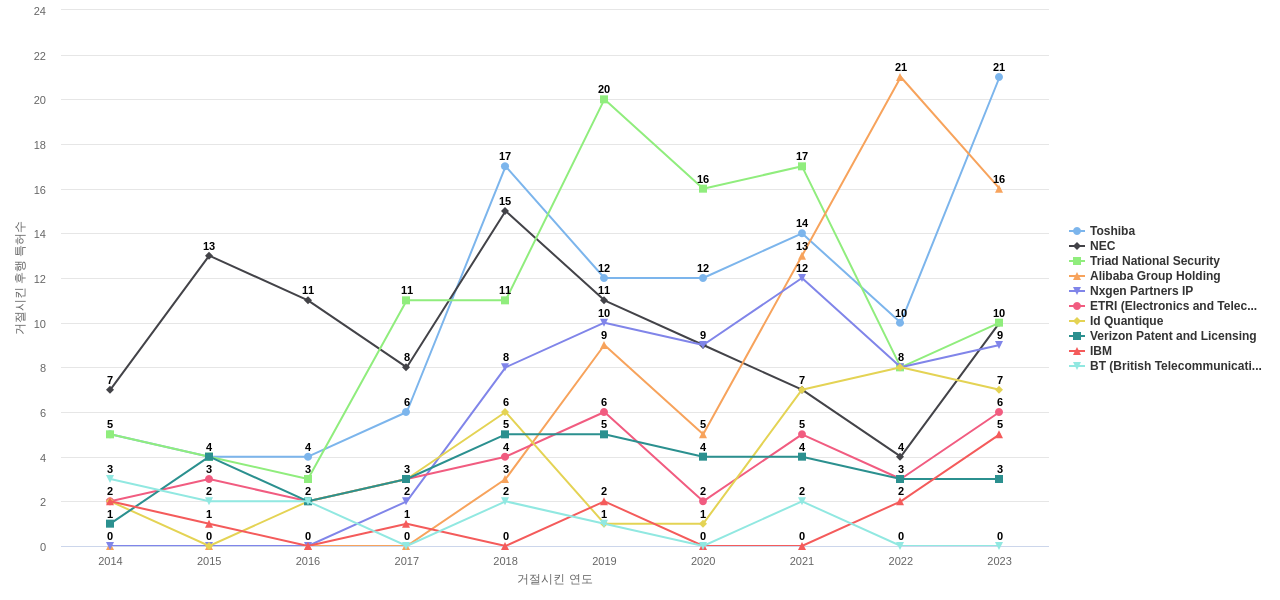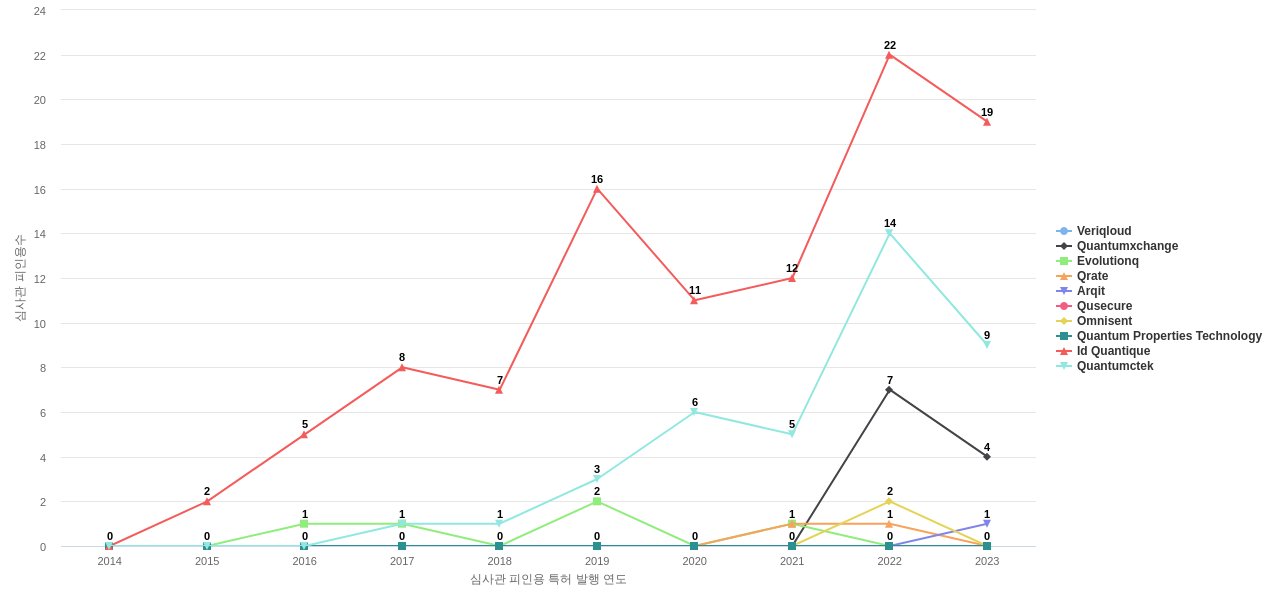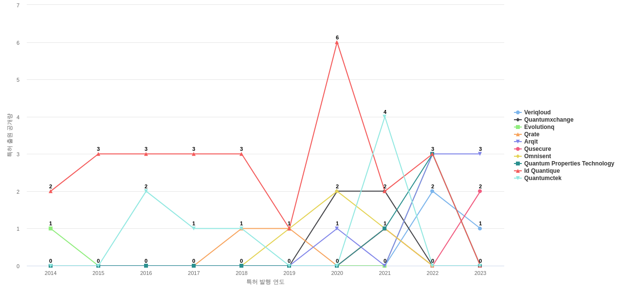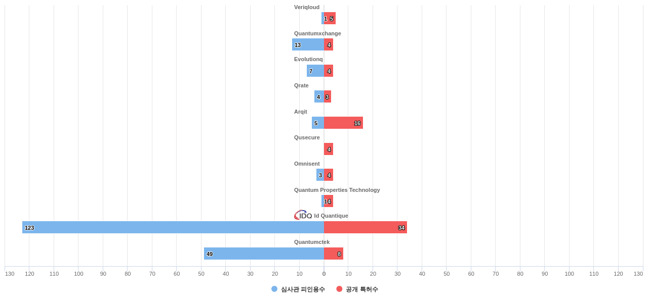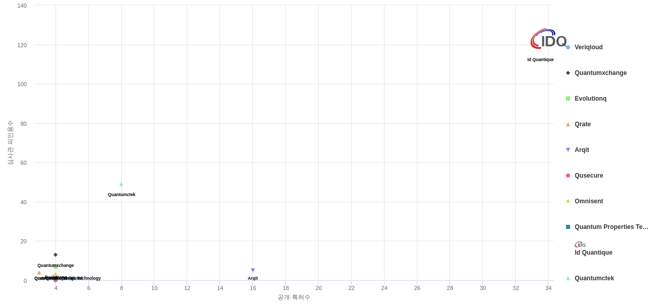 또한 Id Quantique는 공개 특허수(34건), 등록 특허수(29건), 공개 특허수 점유율(점유율_공개)(1.98%), 매입 특허수(11건), 심사관 피인용수(123회), 심사관 피인용수 점유율(점유율_FC-E)(3.66%), 해외 특허 패밀리수(해외 Fam.)(111개), Veriqloud는 집중률(100.0%)에서 1위 입니다. Arqit는 공개 특허수(16건), 공개 특허수 점유율(점유율_공개)(0.93%), 해외 특허 패밀리수(해외 Fam.)(39개), Quantumctek는 등록 특허수(8건), 심사관 피인용수(49회), 심사관 피인용수 점유율(점유율_FC-E)(1.46%), Quantumxchange는 집중률(100.0%), Qrate는 매입 특허수(2건)에서 2위 입니다. Evolutionq는 집중률(100.0%)에서 3위 입니다. Omnisent는 등록 특허수(4건)에서 5위 입니다.