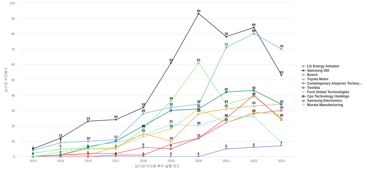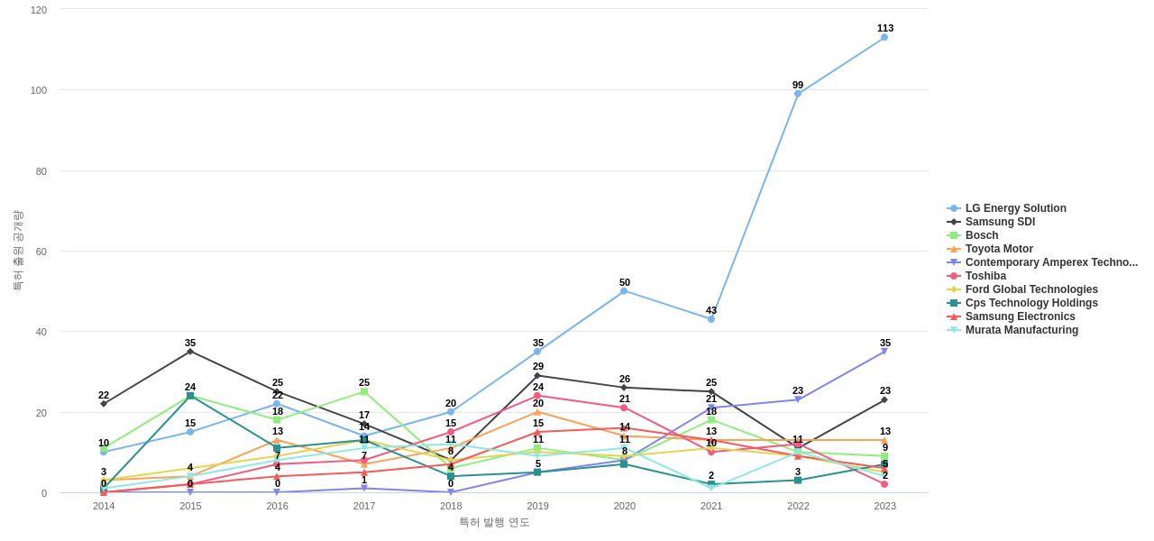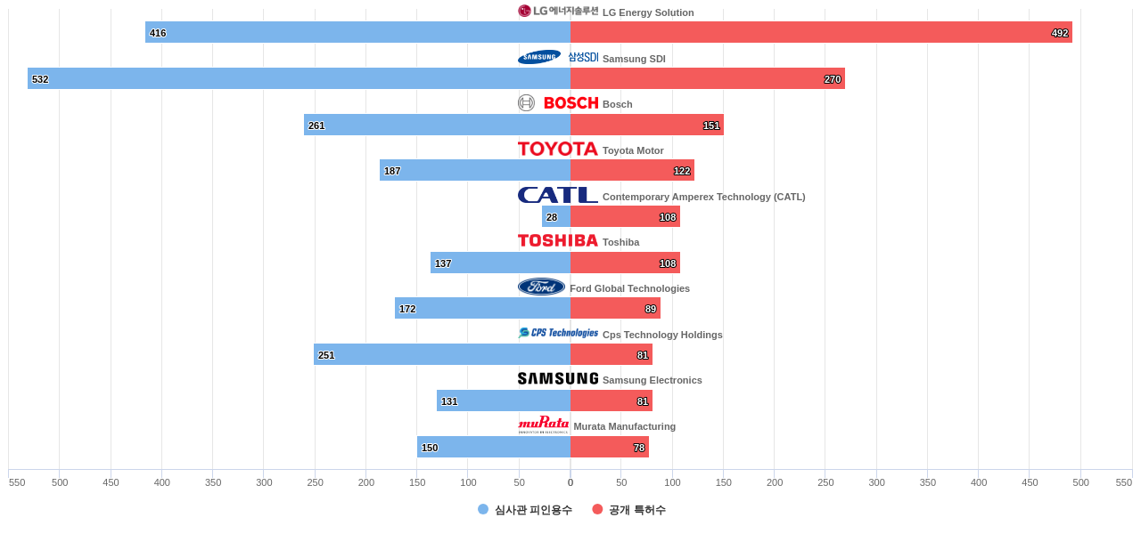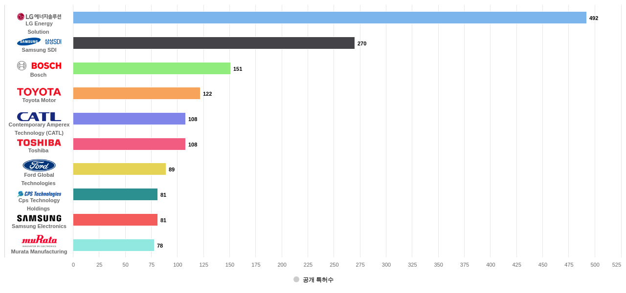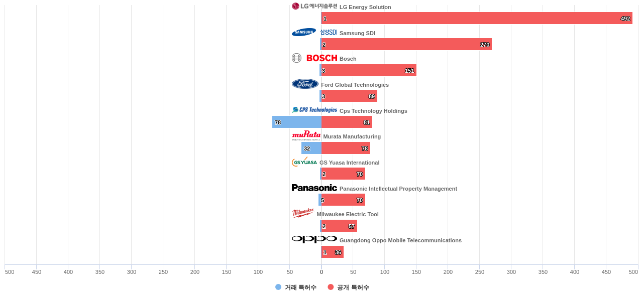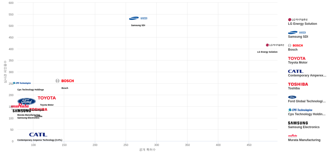 또한 LG Energy Solution은 공개 특허수(492건), 등록 특허수(271건), 공개 특허수 점유율(점유율_공개)(9.1%), 해외 특허 패밀리수(해외 Fam.)(2,378개), Cps Technology Holdings는 집중률(15.4%), 매입 특허수(78건), Samsung SDI은(는) 심사관 피인용수(532회), 심사관 피인용수 점유율(점유율_FC-E)(7.93%)에서 1위 입니다. Murata Manufacturing은 매입 특허수(32건)에서 2위 입니다. Bosch는 공개 특허수(151건), 등록 특허수(101건), 공개 특허수 점유율(점유율_공개)(2.79%), 매입 특허수(3건), 심사관 피인용수(261회), 심사관 피인용수 점유율(점유율_FC-E)(3.89%), 해외 특허 패밀리수(해외 Fam.)(488개), Contemporary Amperex Technology (CATL)는 집중률(4.19%)에서 3위 입니다. Toyota Motor는 공개 특허수(122건), 등록 특허수(90건), 공개 특허수 점유율(점유율_공개)(2.26%), Ford Global Technologies는 매입 특허수(3건)에서 4위 입니다.