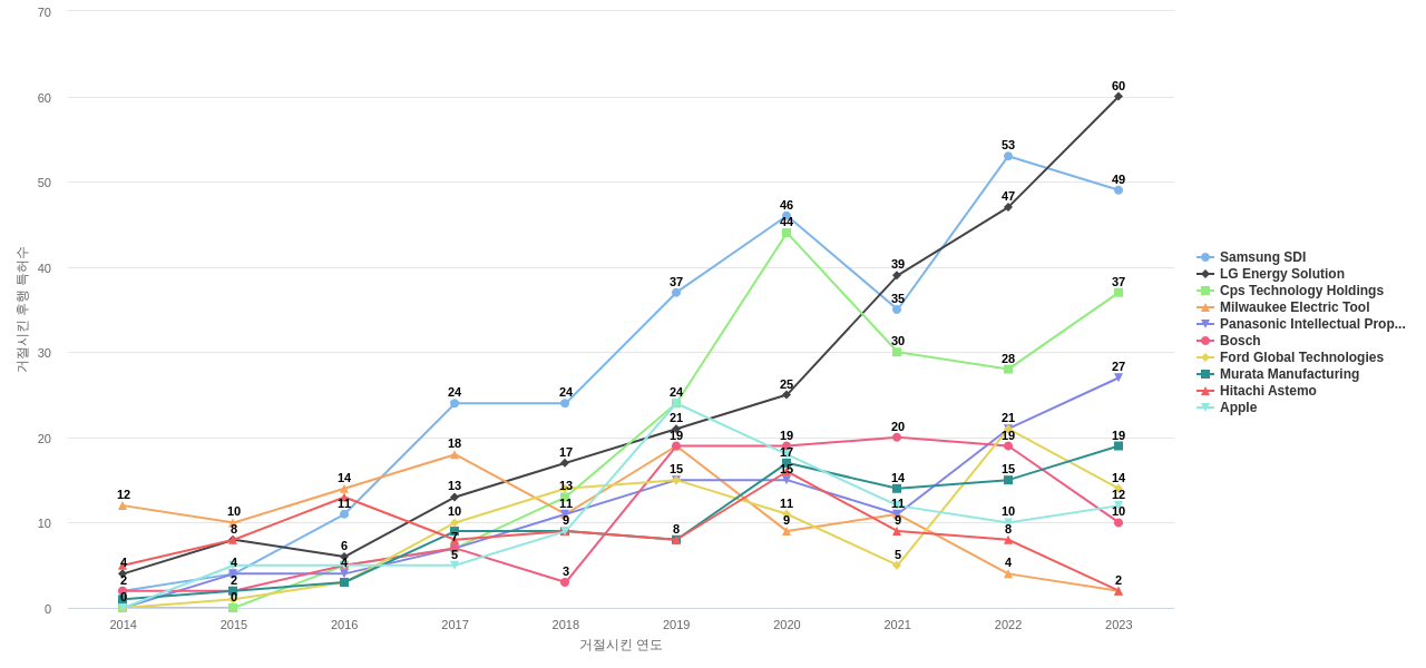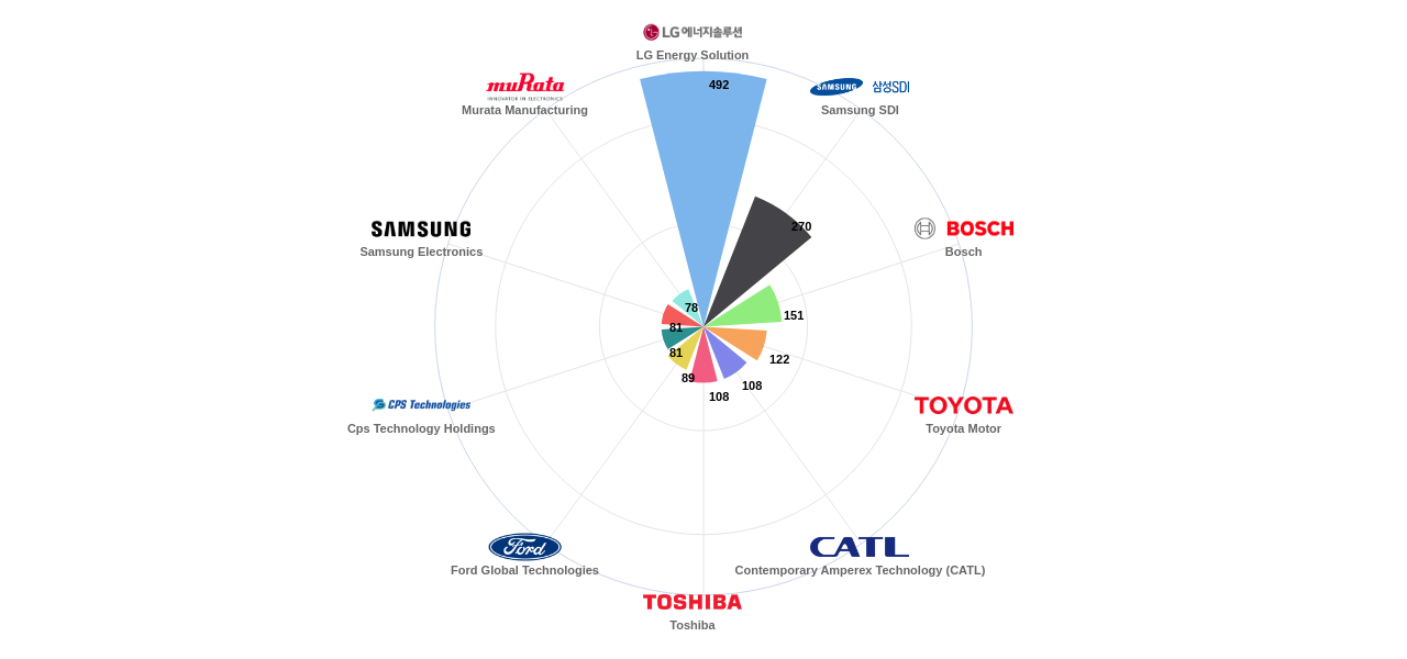 이 분야의 주요 핵심 기업에는 1위 LG Energy Solution, 2위 Samsung SDI, 3위 Bosch 등이 있습니다.