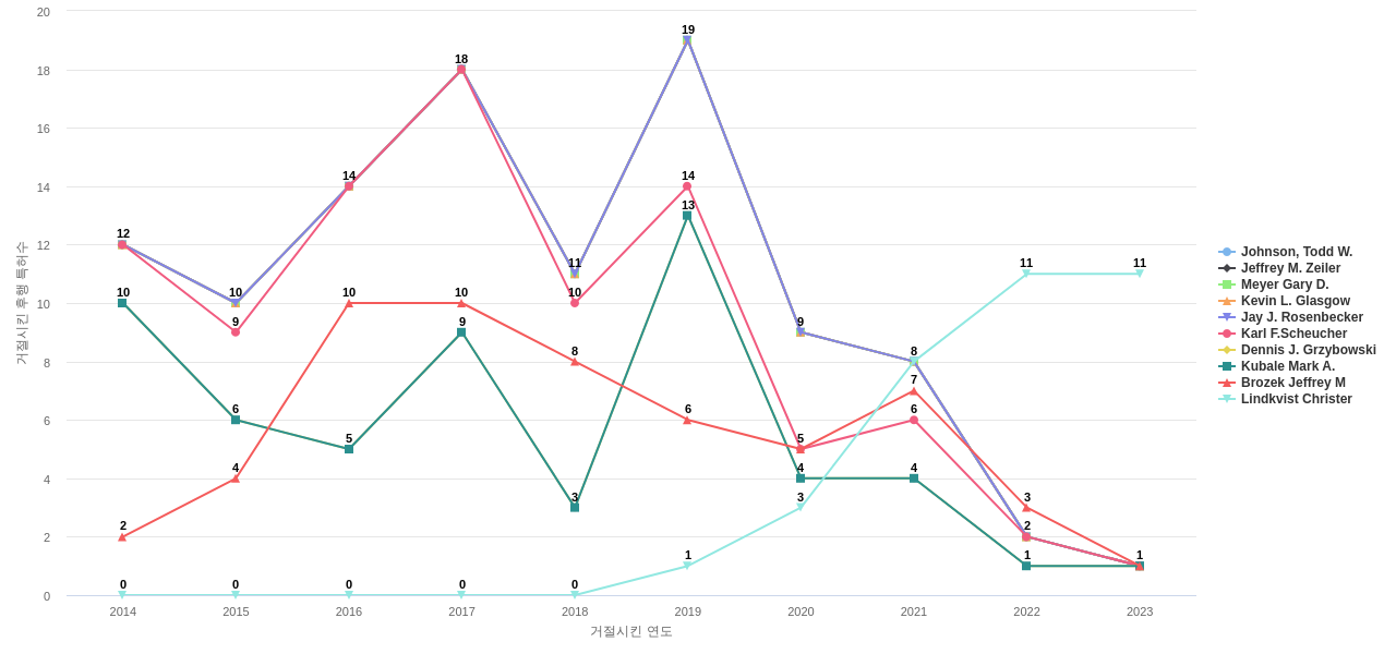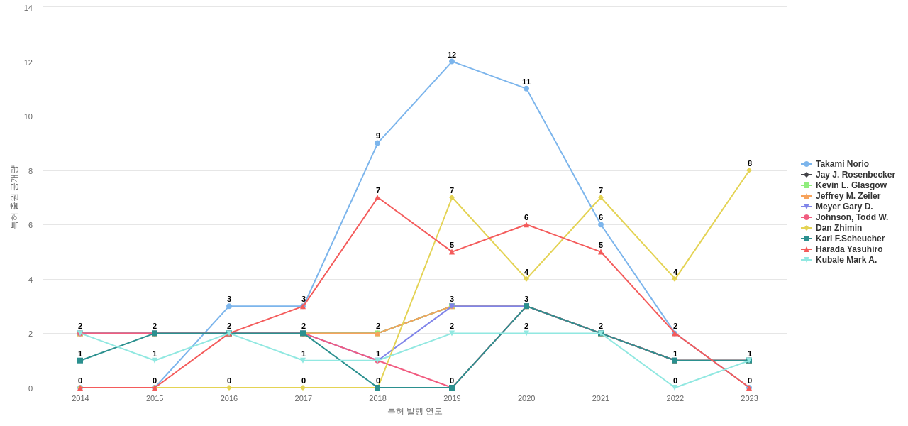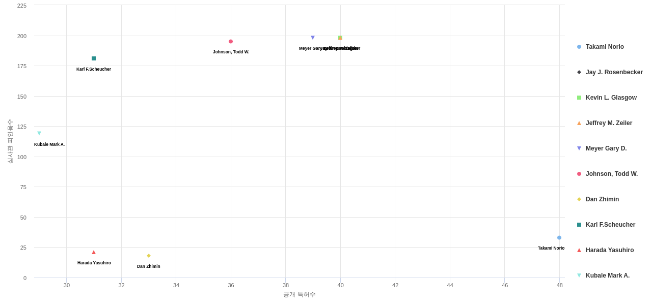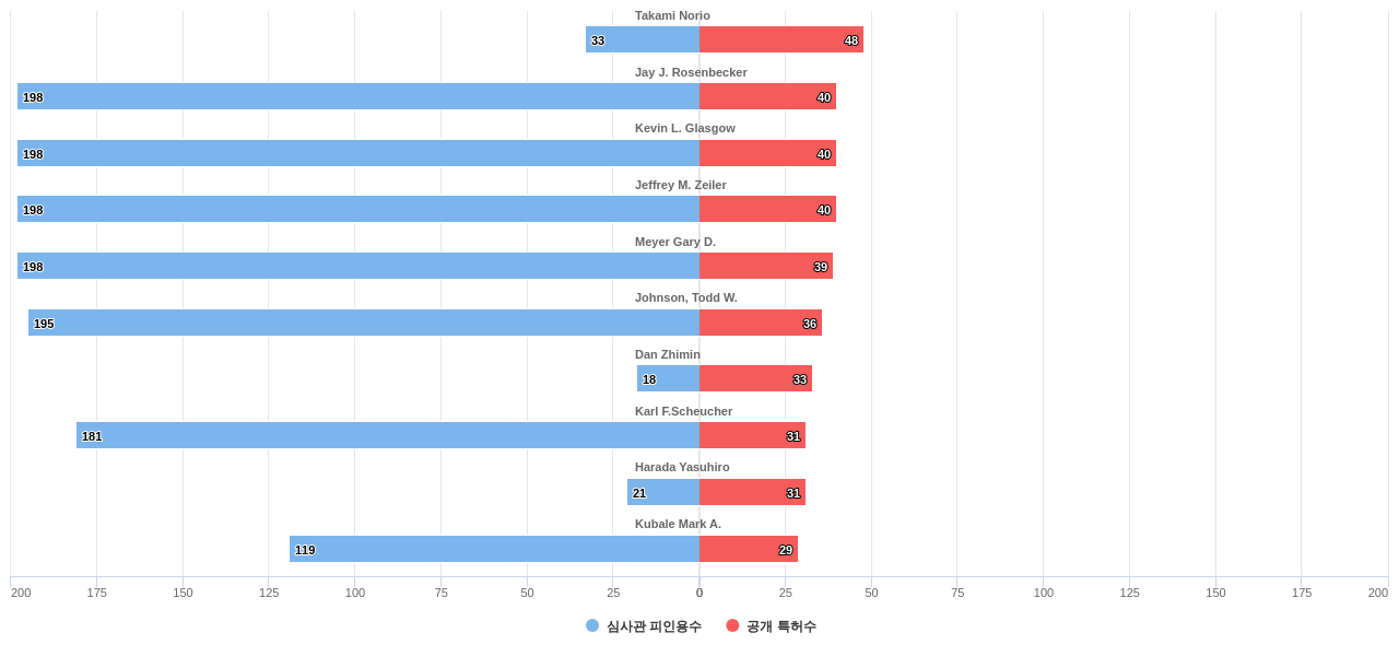 또한 Takami Norio는 발명 특허수(공개 특허수)(48건), 공개 특허수 점유율(점유율_공개)(0.89%), 해외 특허 패밀리수(해외 Fam.)(151개), Jay J. Rosenbecker은 등록 특허수(37건), 거래 특허수(1건), 소송 특허수(1건), 심사관 피인용수(198회), 심사관 피인용수 점유율(점유율_FC-E)(2.95%), Karl F.Scheucher은 집중률(53.4%)에서 1위 입니다. Kevin L. Glasgow는 등록 특허수(37건), 거래 특허수(1건), 소송 특허수(1건), 심사관 피인용수(198회), 심사관 피인용수 점유율(점유율_FC-E)(2.95%), Harada Yasuhiro는 해외 특허 패밀리수(해외 Fam.)(102개)에서 2위 입니다. Jeffrey M. Zeiler는 등록 특허수(37건), 거래 특허수(1건), 소송 특허수(1건), 심사관 피인용수(198회), 심사관 피인용수 점유율(점유율_FC-E)(2.95%), Meyer Gary D.은(는) 집중률(49.4%), Dan Zhimin은 해외 특허 패밀리수(해외 Fam.)(80개)에서 3위 입니다. Johnson, Todd W.은(는) 등록 특허수(33건), 거래 특허수(1건), 소송 특허수(1건), 심사관 피인용수(195회), 심사관 피인용수 점유율(점유율_FC-E)(2.91%), Kubale Mark A.은(는) 집중률(45.3%)에서 5위 입니다.