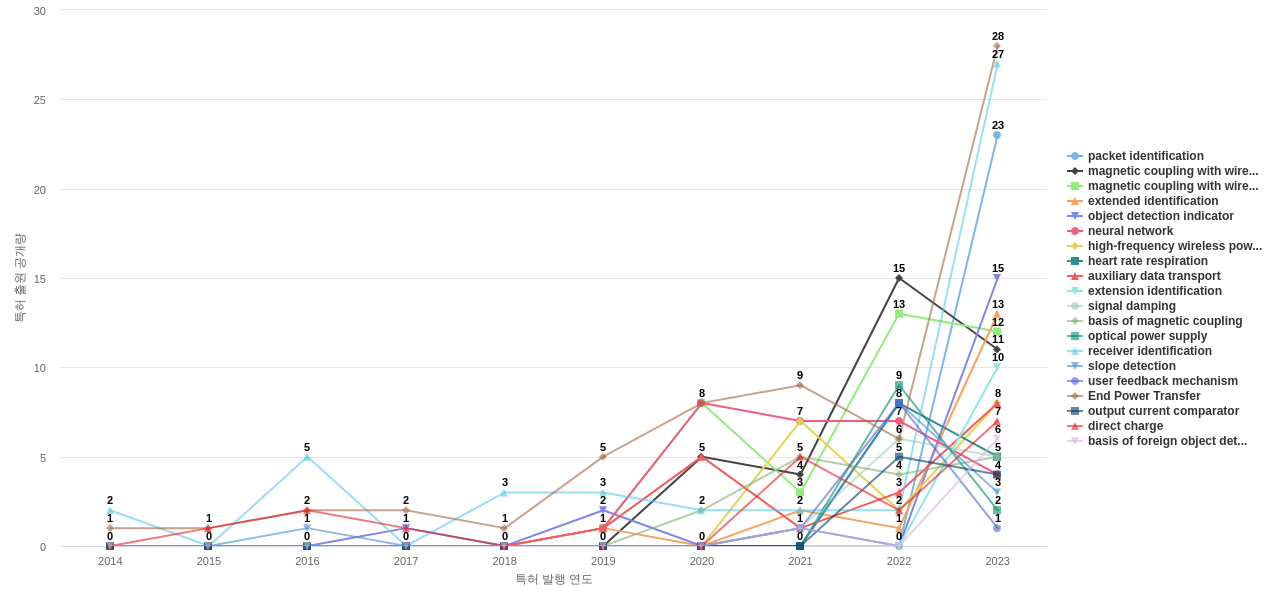1) [기술 기획 조직]/[IP 조직] 고객, 주요 기업, 경쟁사, 밸류 체인이나 공급망 구성 기업의 무선 전력 전송 분야의 특허에 포함된 신규 등장 키워드나 급성장하고 있는 키워드(제품-부품, 소재-물질, 기능-작용, 컨셉 등)를 i) 파악하고, ii) 체계적으로 기술(테크) 센싱과 기술 마켓 센싱을 수행하며, iii) 그 결과를 필요 조직에 전파해야 하지 않을까요?