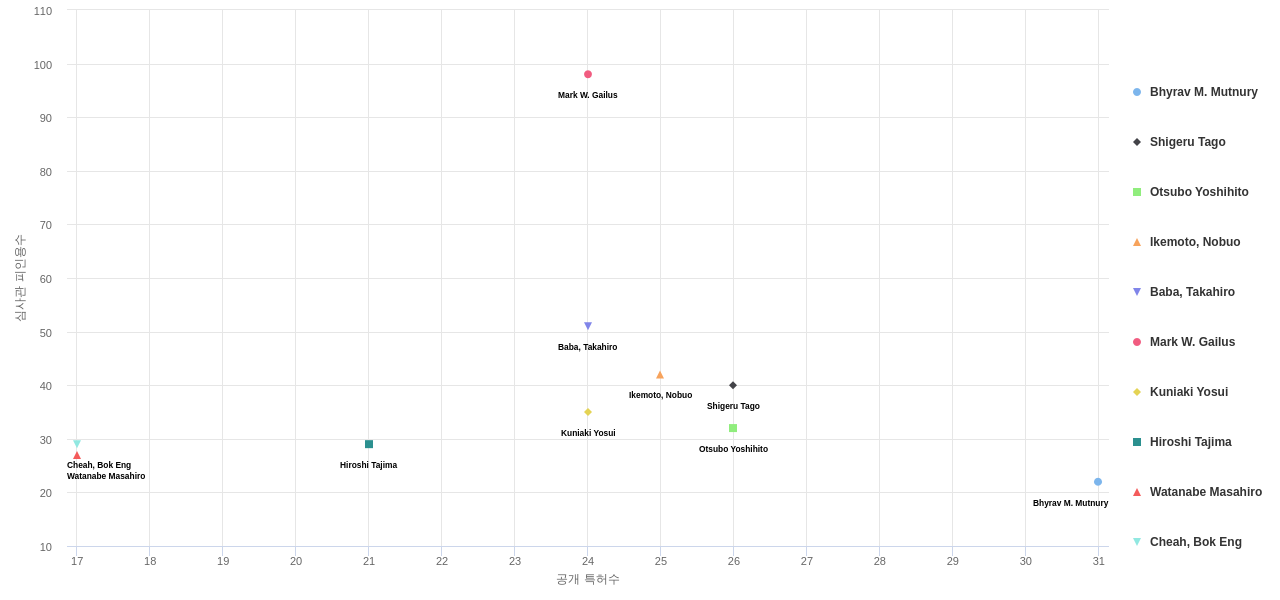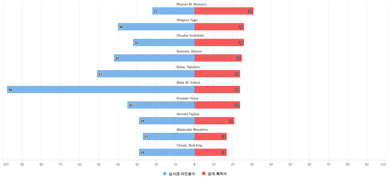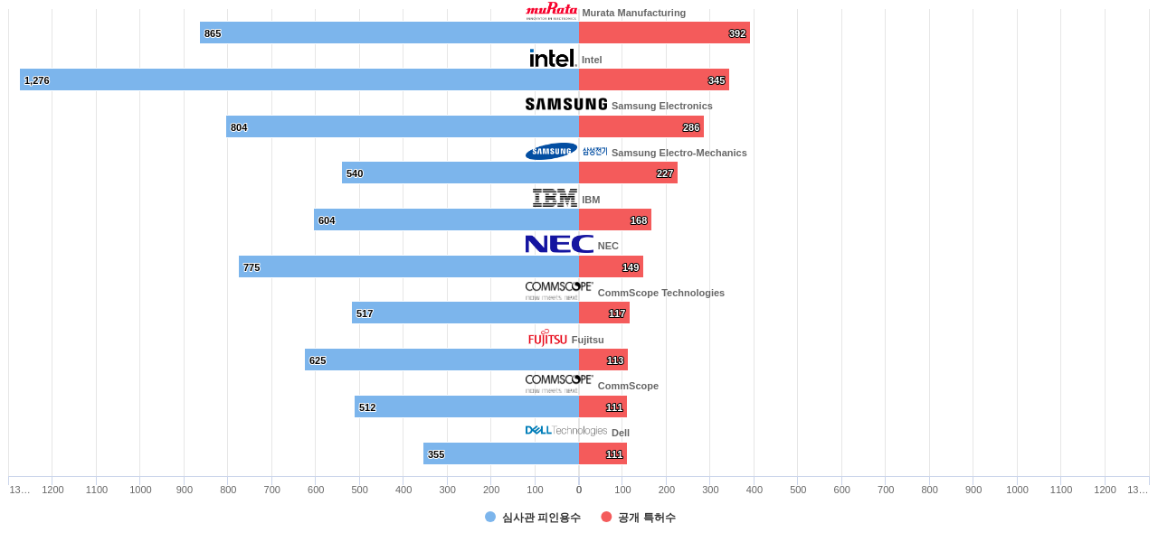 또한 Bhyrav M. Mutnury는 발명 특허수(공개 특허수)(31건), 등록 특허수(29건), 공개 특허수 점유율(점유율_공개)(0.38%), Watanabe Masahiro는 집중률(89.5%), Mark W. Gailus는 거래 특허수(13건), 소송 특허수(1건), 심사관 피인용수(98회), 심사관 피인용수 점유율(점유율_FC-E)(0.46%), Shigeru Tago는 해외 특허 패밀리수(해외 Fam.)(106개)에서 1위 입니다. Hiroshi Tajima는 집중률(84.0%), 해외 특허 패밀리수(해외 Fam.)(97개), Baba, Takahiro는 심사관 피인용수(51회), 심사관 피인용수 점유율(점유율_FC-E)(0.24%)에서 2위 입니다. Otsubo Yoshihito는 발명 특허수(공개 특허수)(26건), 공개 특허수 점유율(점유율_공개)(0.32%), Cheah, Bok Eng은 거래 특허수(2건), Ikemoto, Nobuo는 심사관 피인용수(42회), 심사관 피인용수 점유율(점유율_FC-E)(0.2%), 해외 특허 패밀리수(해외 Fam.)(91개)에서 3위 입니다. Kuniaki Yosui는 등록 특허수(24건), 해외 특허 패밀리수(해외 Fam.)(91개)에서 4위 입니다.