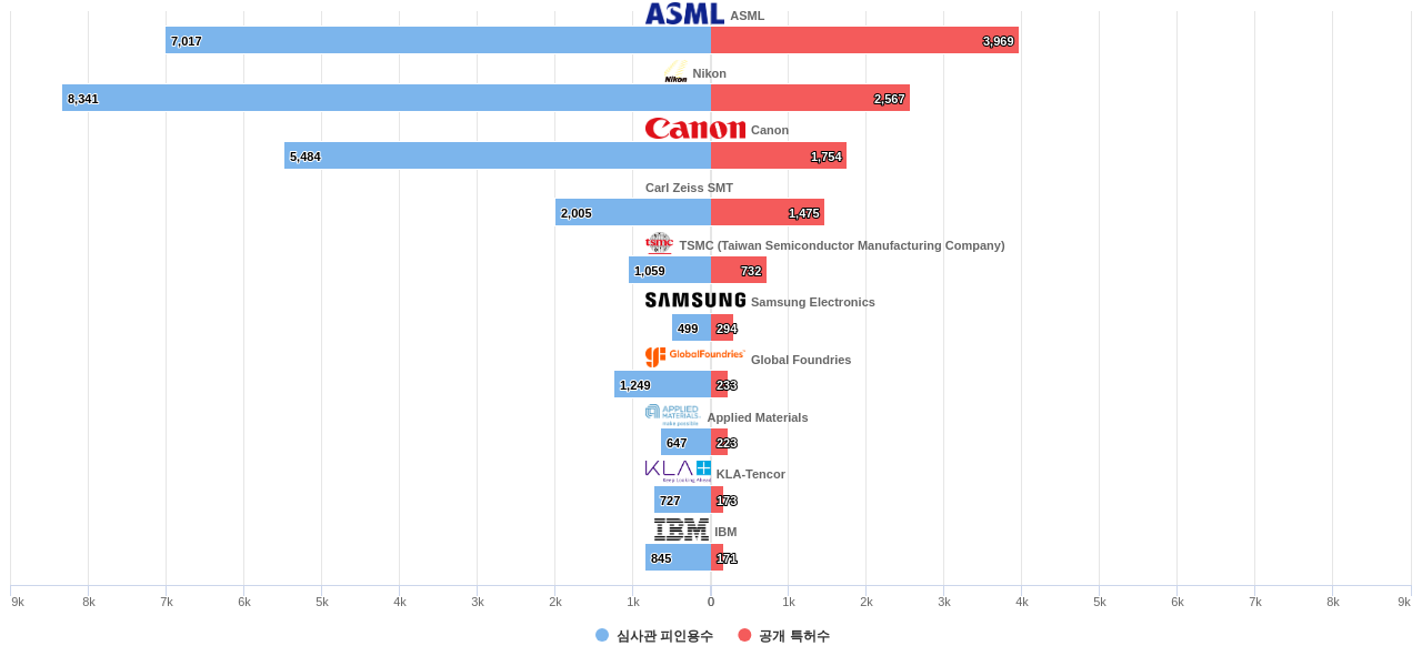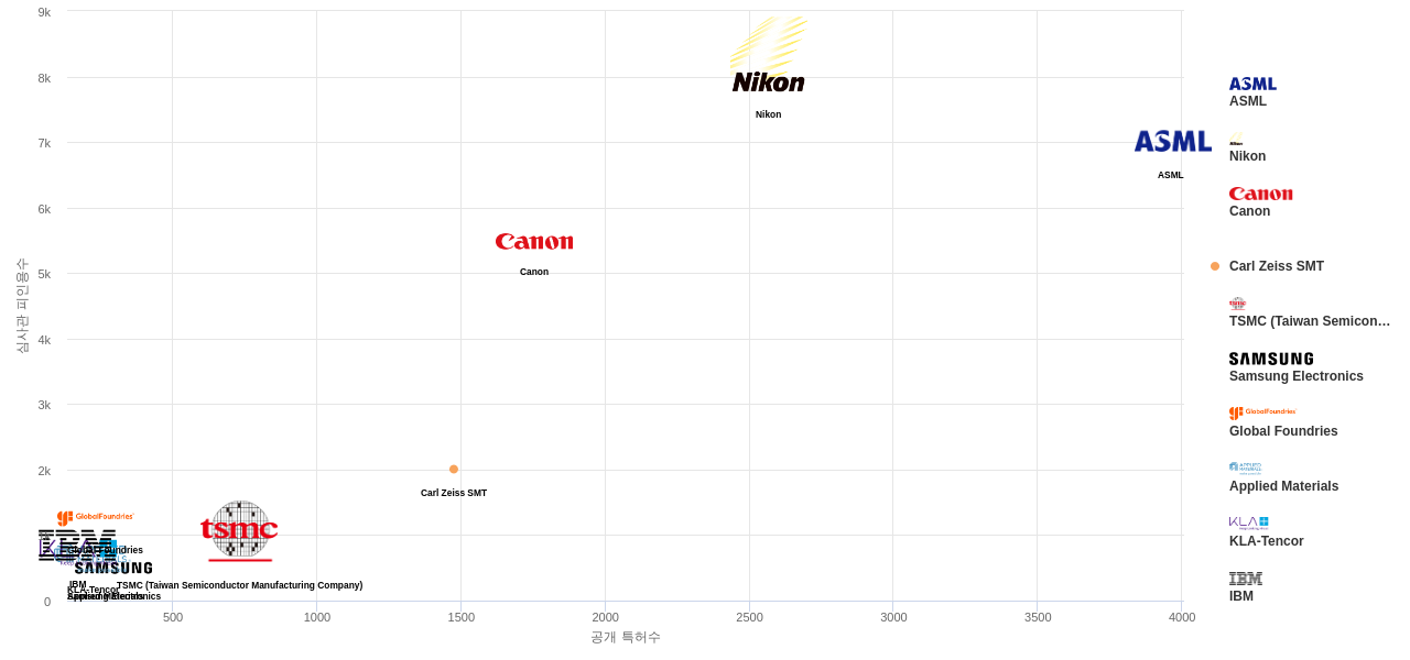 또한 ASML은(는) 공개 특허수(3,969건), 등록 특허수(3,402건), 공개 특허수 점유율(점유율_공개)(22.5%), 집중률(56.9%), 매입 특허수(219건), 소송 특허수(3건), 심판 특허수(2건), 해외 특허 패밀리수(해외 Fam.)(14,103개), Nikon은 심사관 피인용수(8,341회), 심사관 피인용수 점유율(점유율_FC-E)(24.5%)에서 1위 입니다. Carl Zeiss SMT은(는) 집중률(55.5%), 소송 특허수(3건), Global Foundries는 매입 특허수(129건)에서 2위 입니다. Canon은 공개 특허수(1,754건), 등록 특허수(1,541건), 공개 특허수 점유율(점유율_공개)(9.93%), 심사관 피인용수(5,484회), 심사관 피인용수 점유율(점유율_FC-E)(16.1%)에서 3위 입니다. KLA-Tencor은 집중률(8.93%), Applied Materials는 매입 특허수(32건), TSMC (Taiwan Semiconductor Manufacturing Company)은(는) 소송 특허수(1건)에서 4위 입니다.