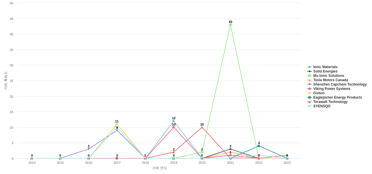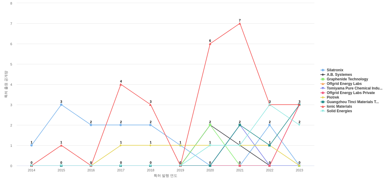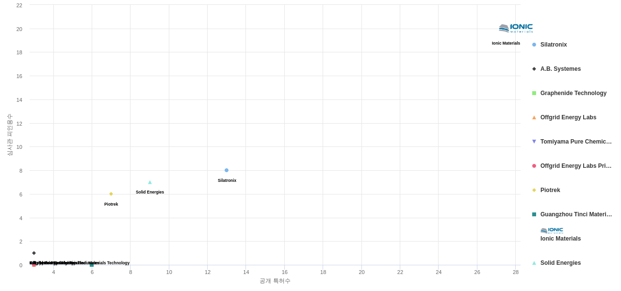 또한 Ionic Materials는 공개 특허수(28건), 등록 특허수(19건), 공개 특허수 점유율(점유율_공개)(0.22%), 매입 특허수(13건), 심사관 피인용수(20회), 심사관 피인용수 점유율(점유율_FC-E)(0.1%), 해외 특허 패밀리수(해외 Fam.)(104개), Silatronix는 집중률(100.0%)에서 1위 입니다. A.B. Systemes는 집중률(100.0%), Solid Energies는 매입 특허수(6건)에서 2위 입니다. Graphenide Technology는 집중률(100.0%), Piotrek는 해외 특허 패밀리수(해외 Fam.)(26개)에서 3위 입니다. Offgrid Energy Labs는 집중률(100.0%), Guangzhou Tinci Materials Technology는 해외 특허 패밀리수(해외 Fam.)(19개)에서 4위 입니다. Tomiyama Pure Chemical Industries는 집중률(100.0%)에서 5위 입니다.