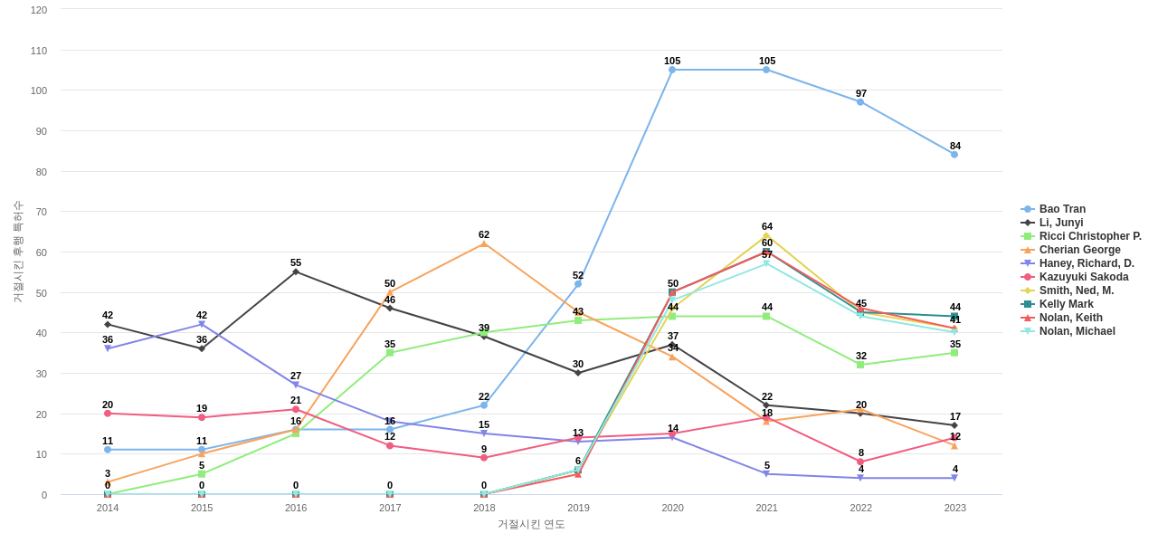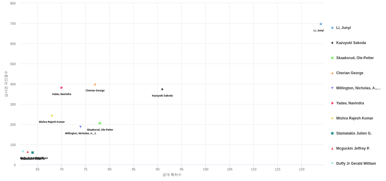 또한 Li, Junyi는 발명 특허수(공개 특허수)(124건), 등록 특허수(107건), 공개 특허수 점유율(점유율_공개)(0.65%), 심사관 피인용수(696회), 심사관 피인용수 점유율(점유율_FC-E)(1.03%), 해외 특허 패밀리수(해외 Fam.)(663개), Stamatakis Julien G.은(는) 집중률(77.1%), Skaaksrud, Ole-Petter는 거래 특허수(78건), Kazuyuki Sakoda는 소송 특허수(4건)에서 1위 입니다. Millington, Nicholas, A., J.은(는) 집중률(42.3%), 소송 특허수(4건), Cherian George는 심사관 피인용수(399회), 심사관 피인용수 점유율(점유율_FC-E)(0.59%), 해외 특허 패밀리수(해외 Fam.)(345개)에서 2위 입니다. Yadav, Navindra는 심사관 피인용수(381회), 심사관 피인용수 점유율(점유율_FC-E)(0.56%)에서 3위 입니다. Mishra Rajesh Kumar는 집중률(38.4%), Mcguckin Jeffrey P.은(는) 해외 특허 패밀리수(해외 Fam.)(61개)에서 4위 입니다. Duffy Jr Gerald William은 해외 특허 패밀리수(해외 Fam.)(61개)에서 5위 입니다.