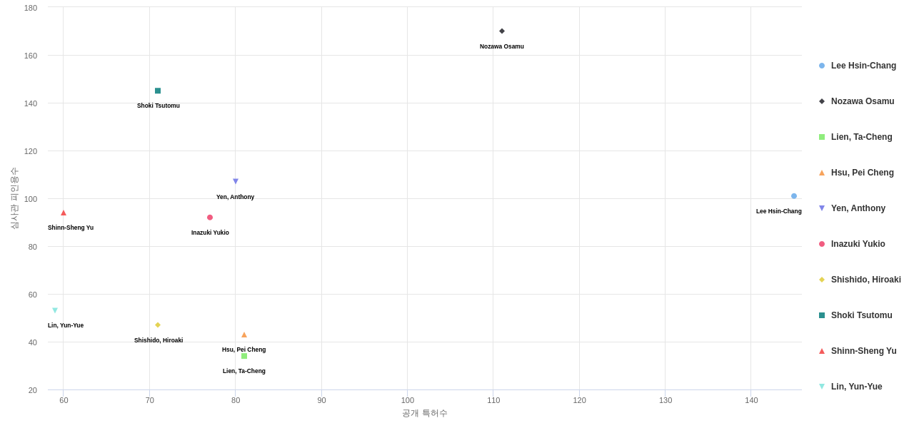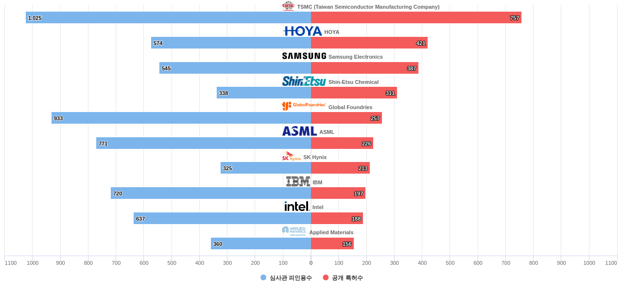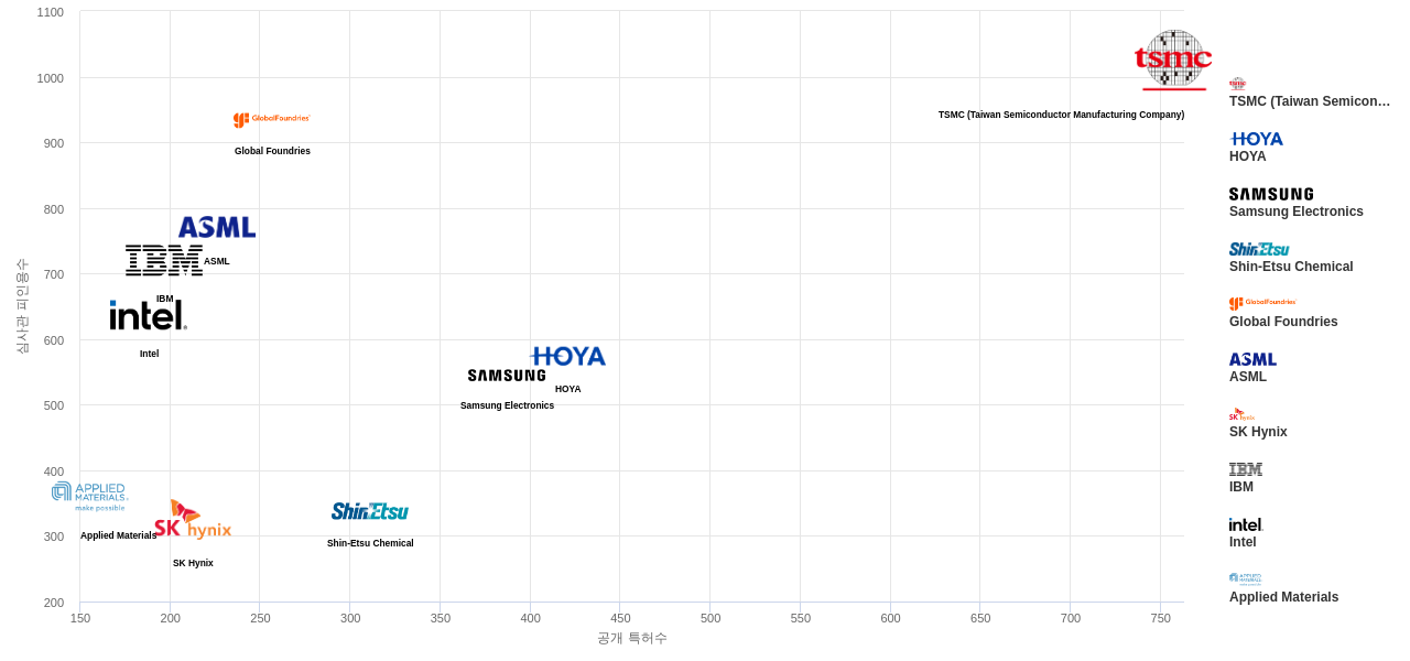 또한 TSMC (Taiwan Semiconductor Manufacturing Company)은(는) 공개 특허수(757건), 등록 특허수(626건), 공개 특허수 점유율(점유율_공개)(9.37%), 심사관 피인용수(1,025회), 심사관 피인용수 점유율(점유율_FC-E)(7.5%), HOYA은(는) 집중률(10.0%), 해외 특허 패밀리수(해외 Fam.)(1,671개), Global Foundries는 매입 특허수(165건)에서 1위 입니다. Shin-Etsu Chemical은 집중률(4.18%), 해외 특허 패밀리수(해외 Fam.)(1,426개)에서 2위 입니다. Samsung Electronics는 공개 특허수(387건), 등록 특허수(286건), 공개 특허수 점유율(점유율_공개)(4.79%), ASML은(는) 집중률(3.24%), 매입 특허수(20건), 심사관 피인용수(771회), 심사관 피인용수 점유율(점유율_FC-E)(5.64%), 해외 특허 패밀리수(해외 Fam.)(930개)에서 3위 입니다. Applied Materials는 매입 특허수(10건), IBM은(는) 심사관 피인용수(720회), 심사관 피인용수 점유율(점유율_FC-E)(5.27%)에서 4위 입니다. Intel은 매입 특허수(2건), 심사관 피인용수(637회), 심사관 피인용수 점유율(점유율_FC-E)(4.66%)에서 5위 입니다.
