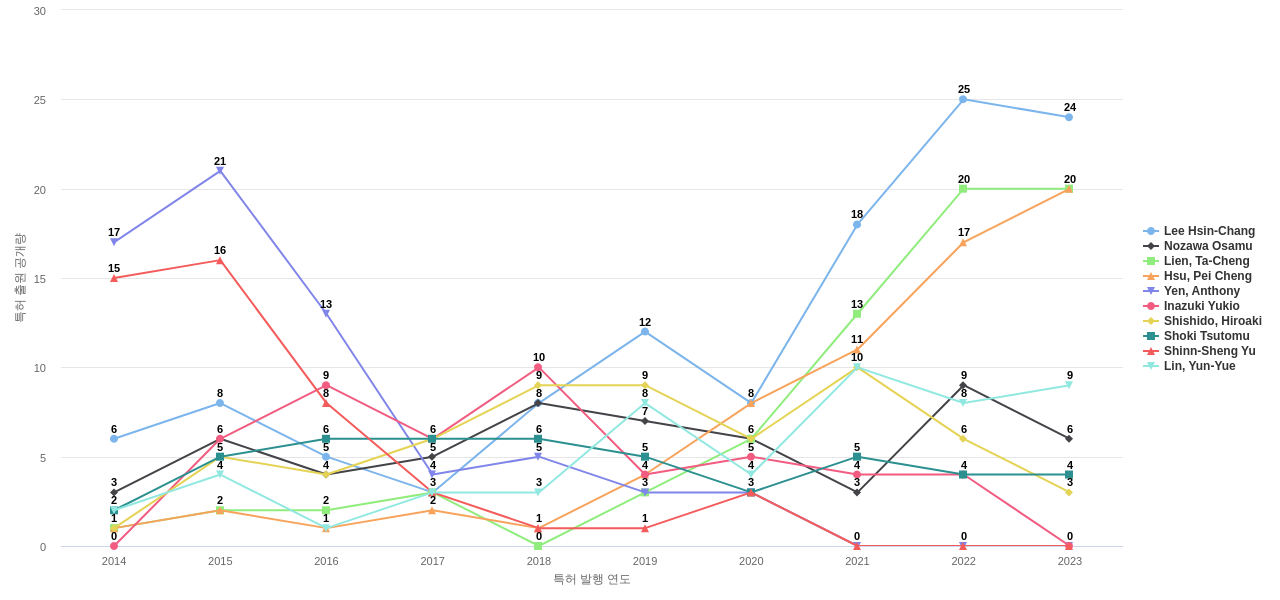 또한 Lee Hsin-Chang은 발명 특허수(공개 특허수)(145건), 등록 특허수(101건), 공개 특허수 점유율(점유율_공개)(1.79%), Shishido, Hiroaki는 집중률(97.3%), Inazuki Yukio는 거래 특허수(1건), Nozawa Osamu는 심사관 피인용수(170회), 심사관 피인용수 점유율(점유율_FC-E)(1.24%), 해외 특허 패밀리수(해외 Fam.)(465개)에서 1위 입니다. Shoki Tsutomu는 집중률(92.2%), 심사관 피인용수(145회), 심사관 피인용수 점유율(점유율_FC-E)(1.06%)에서 2위 입니다. Lien, Ta-Cheng은 발명 특허수(공개 특허수)(81건), 공개 특허수 점유율(점유율_공개)(1.0%), Yen, Anthony는 등록 특허수(79건), 심사관 피인용수(107회), 심사관 피인용수 점유율(점유율_FC-E)(0.78%)에서 3위 입니다. Hsu, Pei Cheng은 발명 특허수(공개 특허수)(81건), 공개 특허수 점유율(점유율_공개)(1.0%), Lin, Yun-Yue는 집중률(90.8%)에서 4위 입니다. Shinn-Sheng Yu는 심사관 피인용수(94회), 심사관 피인용수 점유율(점유율_FC-E)(0.69%)에서 5위 입니다.