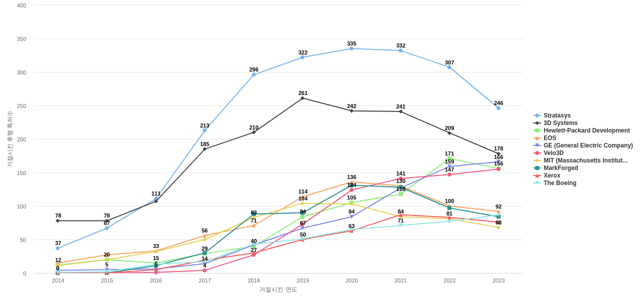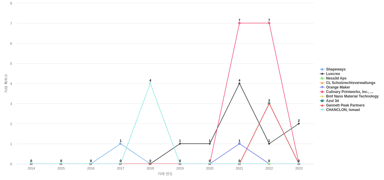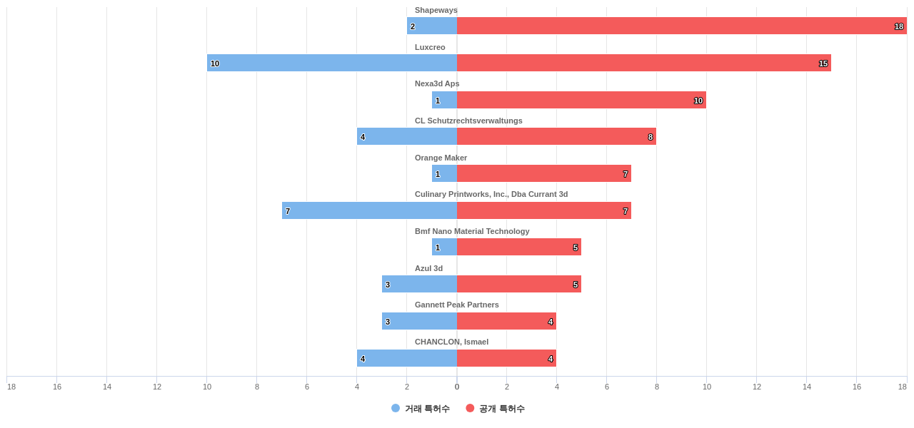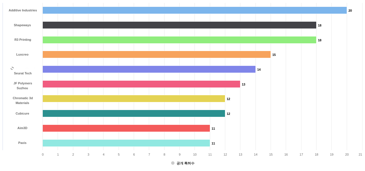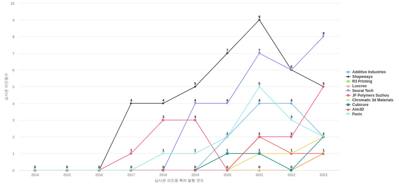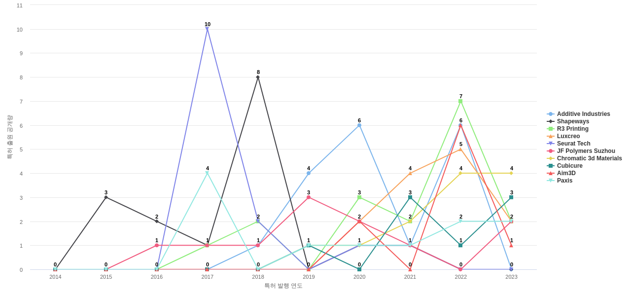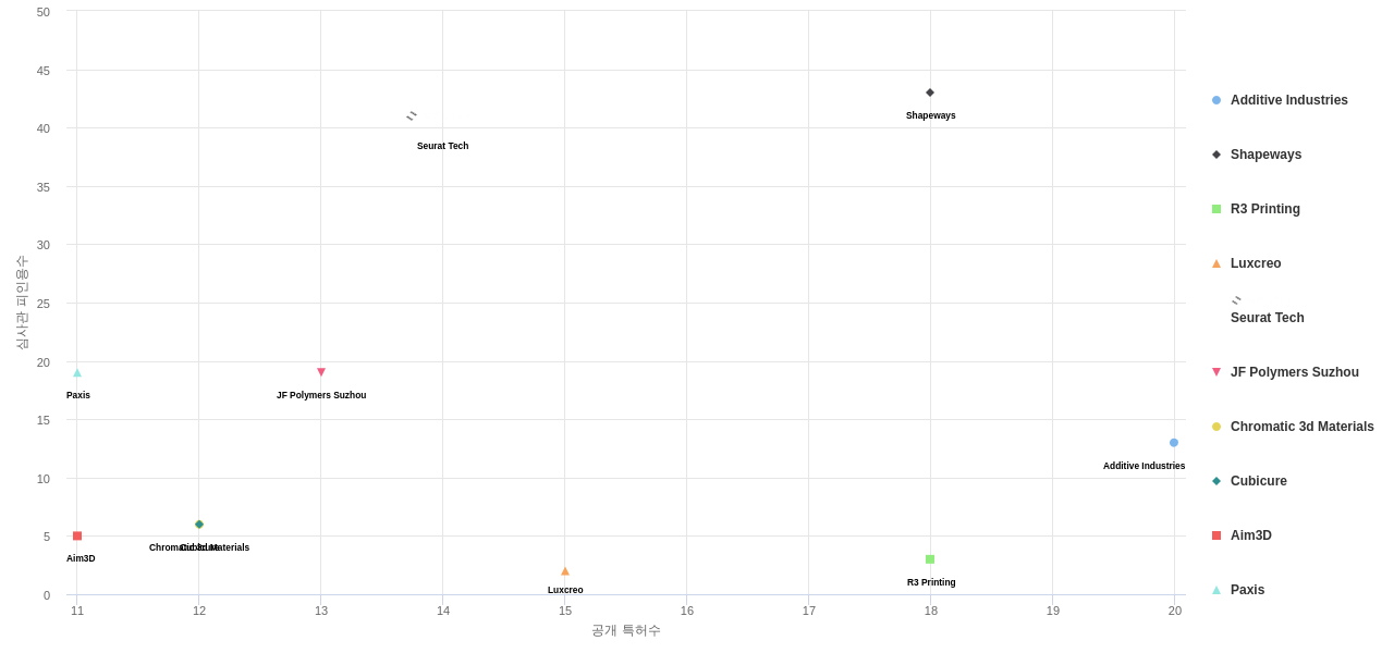 또한 Additive Industries는 공개 특허수(20건), 등록 특허수(11건), 공개 특허수 점유율(점유율_공개)(0.09%), 집중률(100.0%), Luxcreo는 매입 특허수(10건), Shapeways는 심사관 피인용수(43회), 심사관 피인용수 점유율(점유율_FC-E)(0.22%), Seurat Tech은 해외 특허 패밀리수(해외 Fam.)(91개)에서 1위 입니다. R3 Printing은 공개 특허수(18건), 공개 특허수 점유율(점유율_공개)(0.08%), 집중률(100.0%), JF Polymers Suzhou는 심사관 피인용수(19회), 심사관 피인용수 점유율(점유율_FC-E)(0.1%)에서 3위 입니다. Paxis는 심사관 피인용수(19회), 심사관 피인용수 점유율(점유율_FC-E)(0.1%), Cubicure는 해외 특허 패밀리수(해외 Fam.)(42개)에서 4위 입니다. Aim3D는 해외 특허 패밀리수(해외 Fam.)(35개)에서 5위 입니다.