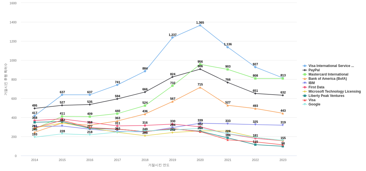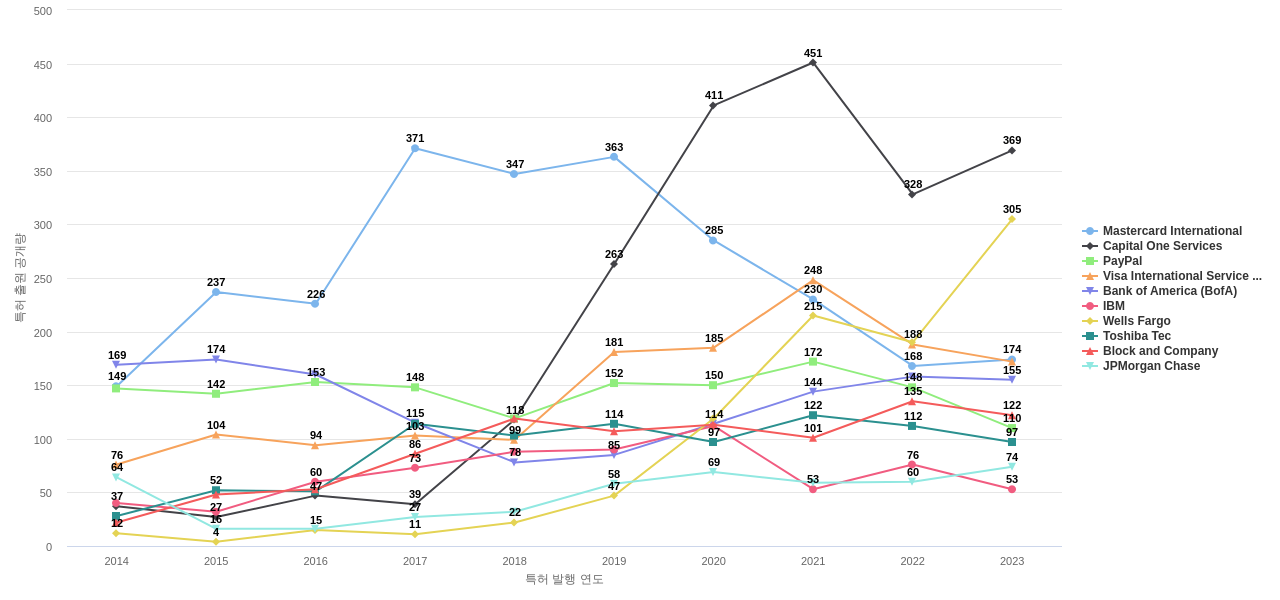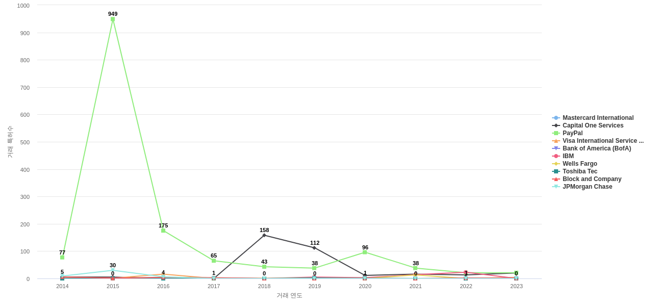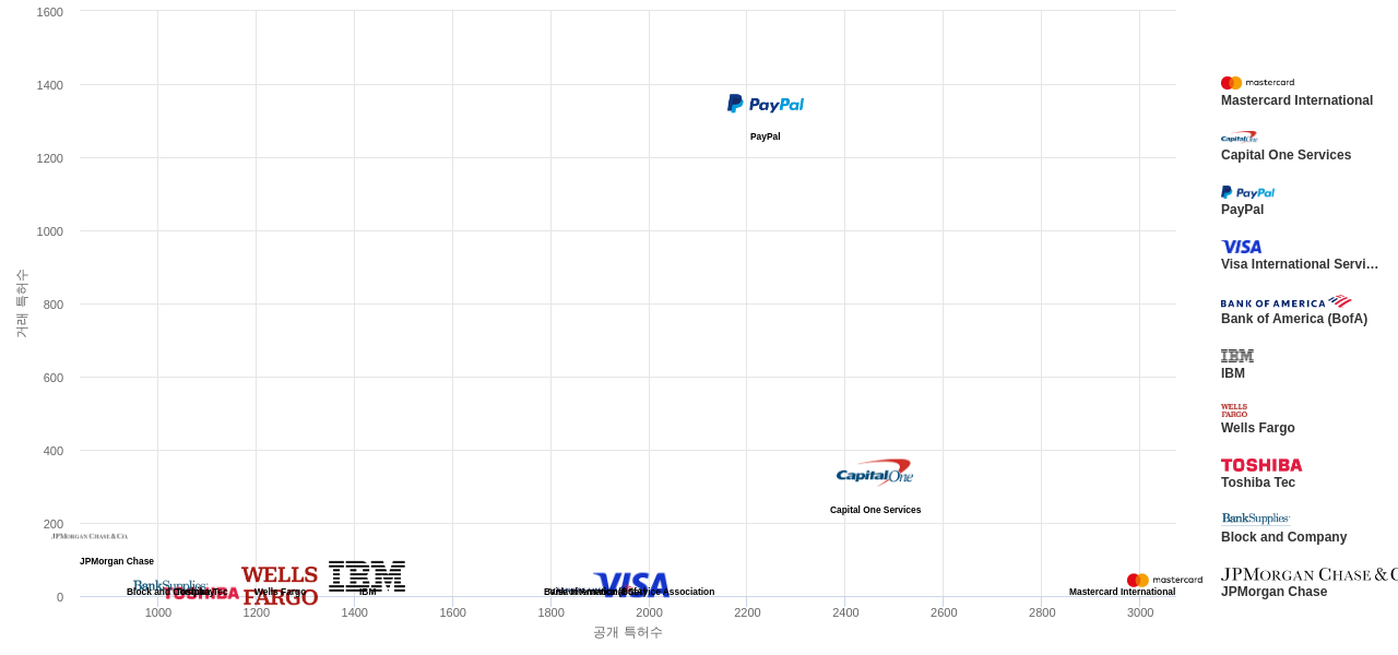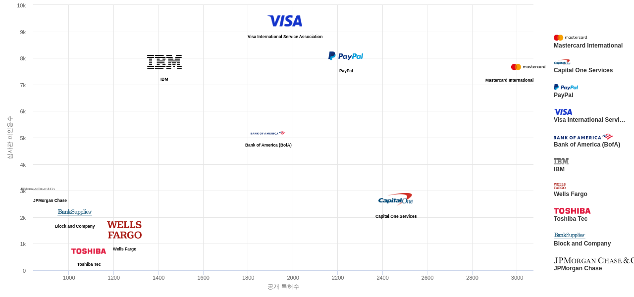 또한 Mastercard International은 공개 특허수(3,051건), 공개 특허수 점유율(점유율_공개)(3.27%), 해외 특허 패밀리수(해외 Fam.)(4,391개), Capital One Services는 등록 특허수(1,671건), Block and Company는 집중률(79.3%), PayPal은 매입 특허수(1,347건), 소송 특허수(20건), Visa International Service Association은 심사관 피인용수(9,401회), 심사관 피인용수 점유율(점유율_FC-E)(4.52%)에서 1위 입니다. JPMorgan Chase는 소송 특허수(6건)에서 2위 입니다. IBM은(는) 심사관 피인용수(7,853회), 심사관 피인용수 점유율(점유율_FC-E)(3.78%), Toshiba Tec은 해외 특허 패밀리수(해외 Fam.)(1,819개)에서 3위 입니다. Bank of America (BofA)는 공개 특허수(1,890건), 등록 특허수(1,026건), 공개 특허수 점유율(점유율_공개)(2.02%), 심사관 피인용수(5,178회), 심사관 피인용수 점유율(점유율_FC-E)(2.49%)에서 5위 입니다.