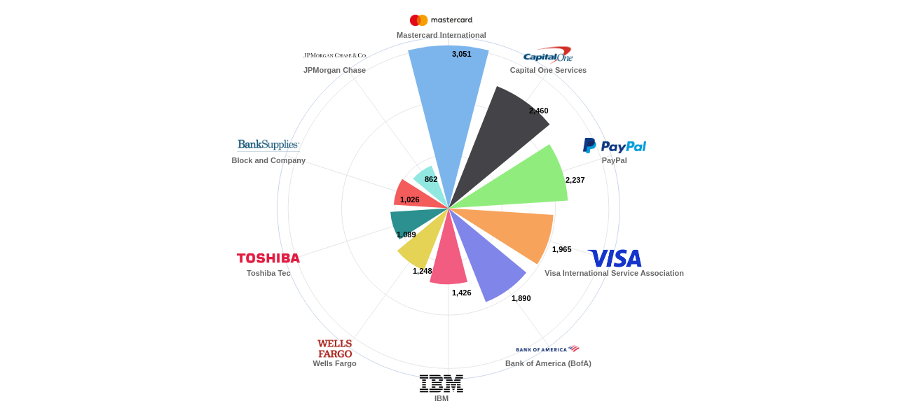 이 분야의 주요 핵심 기업에는 1위 Mastercard International, 2위 Capital One Services, 3위 PayPal 등이 있습니다.
