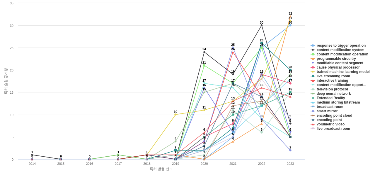1) [기술 기획 조직]/[IP 조직] 고객, 주요 기업, 경쟁사, 밸류 체인이나 공급망 구성 기업의 대화형 TV/VOD 분야의 특허에 포함된 신규 등장 키워드나 급성장하고 있는 키워드(제품-부품, 소재-물질, 기능-작용, 컨셉 등)를 i) 파악하고, ii) 체계적으로 기술(테크) 센싱과 기술 마켓 센싱을 수행하며, iii) 그 결과를 필요 조직에 전파해야 하지 않을까요?