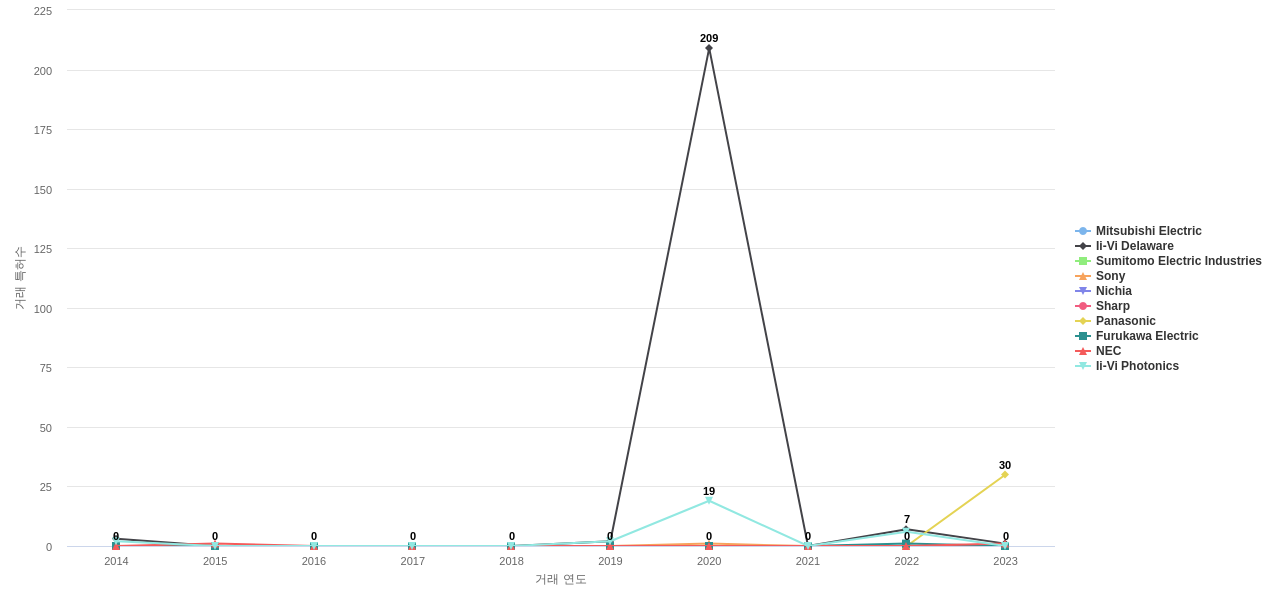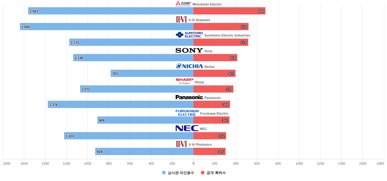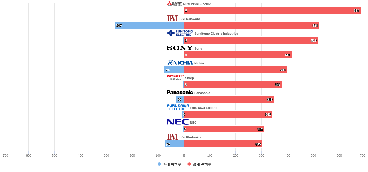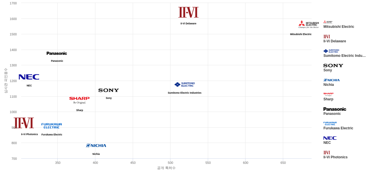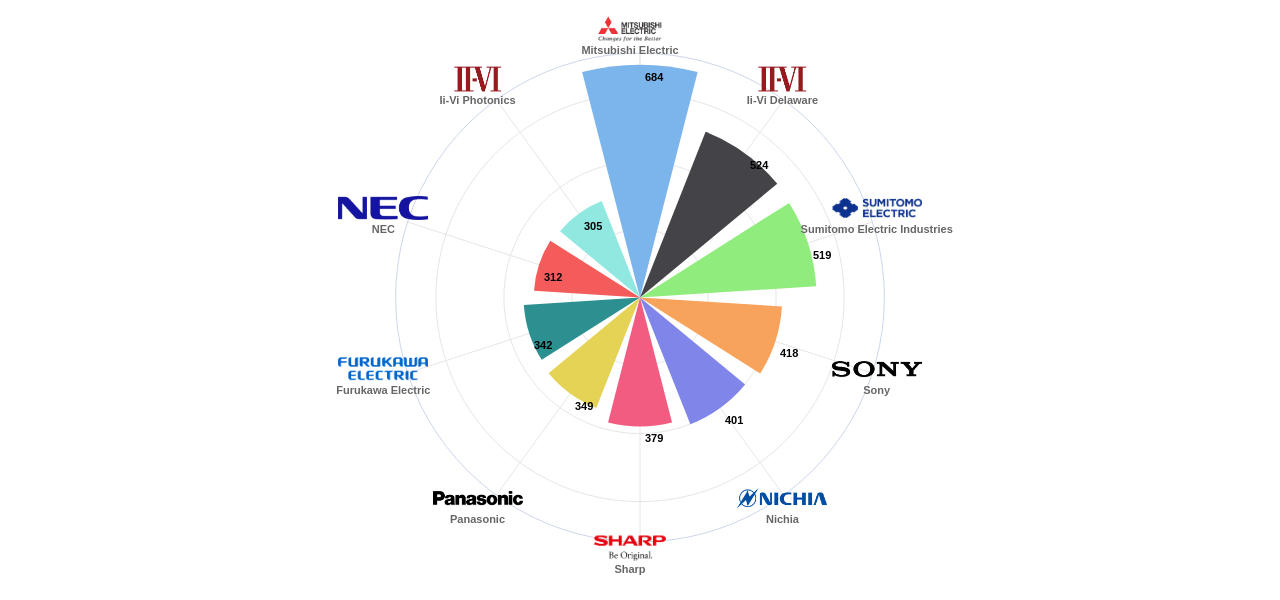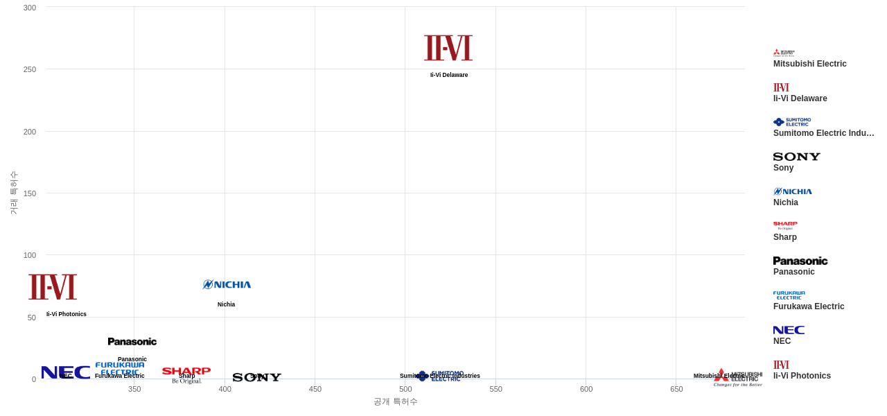 또한 Mitsubishi Electric은 공개 특허수(684건), 등록 특허수(540건), 공개 특허수 점유율(점유율_공개)(4.04%), 해외 특허 패밀리수(해외 Fam.)(1,296개), Ii-Vi Delaware은 집중률(17.4%), 매입 특허수(267건), 소송 특허수(1건), 심사관 피인용수(1,640회), 심사관 피인용수 점유율(점유율_FC-E)(5.81%)에서 1위 입니다. Ii-Vi Photonics는 집중률(13.5%), Nichia는 매입 특허수(76건), 소송 특허수(1건), Sumitomo Electric Industries는 해외 특허 패밀리수(해외 Fam.)(1,028개)에서 2위 입니다. Panasonic은 심사관 피인용수(1,376회), 심사관 피인용수 점유율(점유율_FC-E)(4.87%), Sony는 해외 특허 패밀리수(해외 Fam.)(984개)에서 3위 입니다. Furukawa Electric은 집중률(8.82%), NEC은 심사관 피인용수(1,224회), 심사관 피인용수 점유율(점유율_FC-E)(4.33%), Sharp는 해외 특허 패밀리수(해외 Fam.)(982개)에서 4위 입니다.