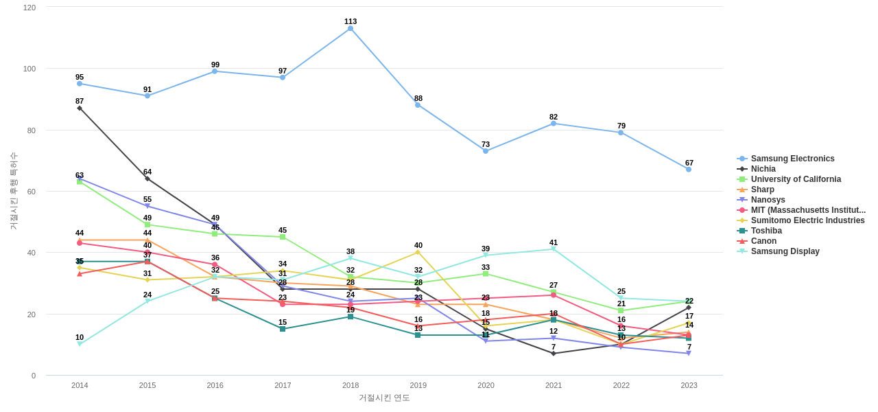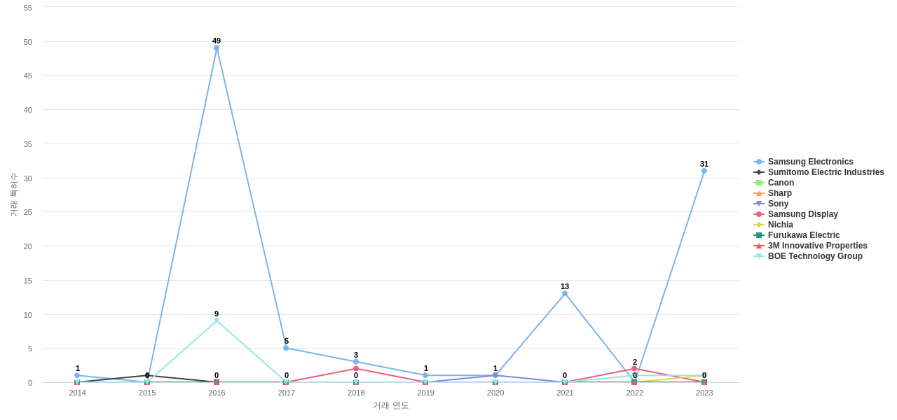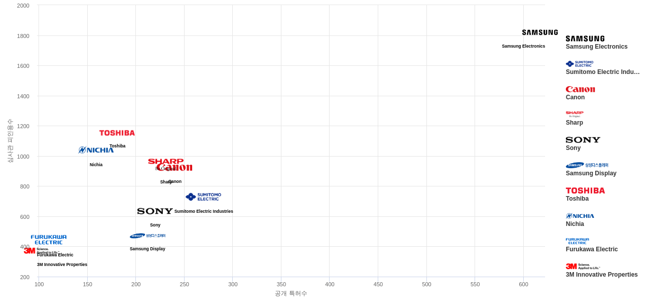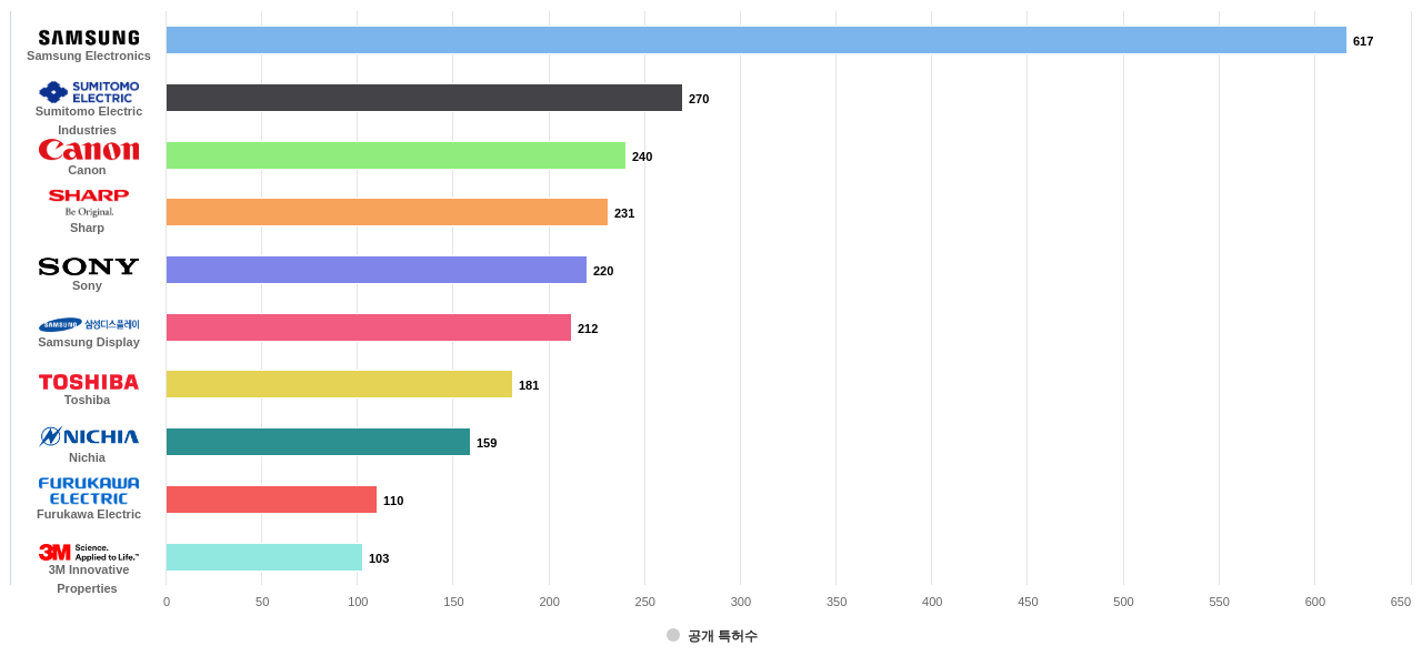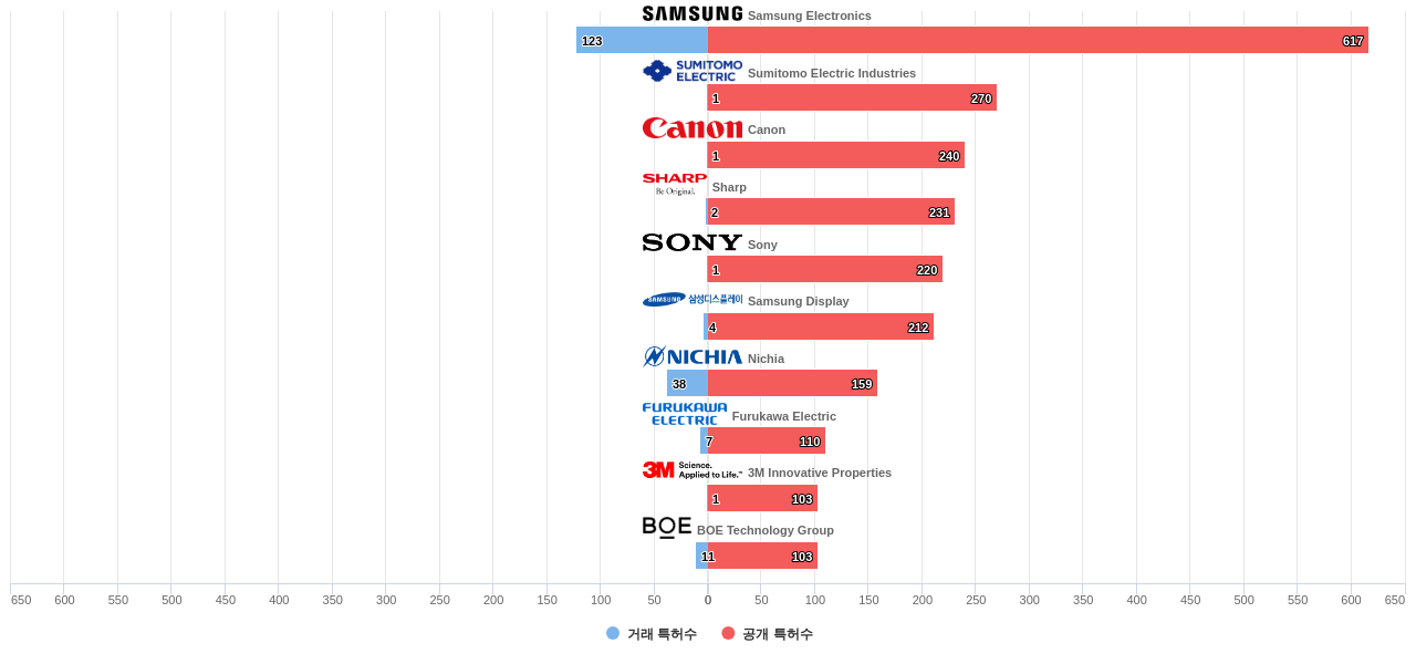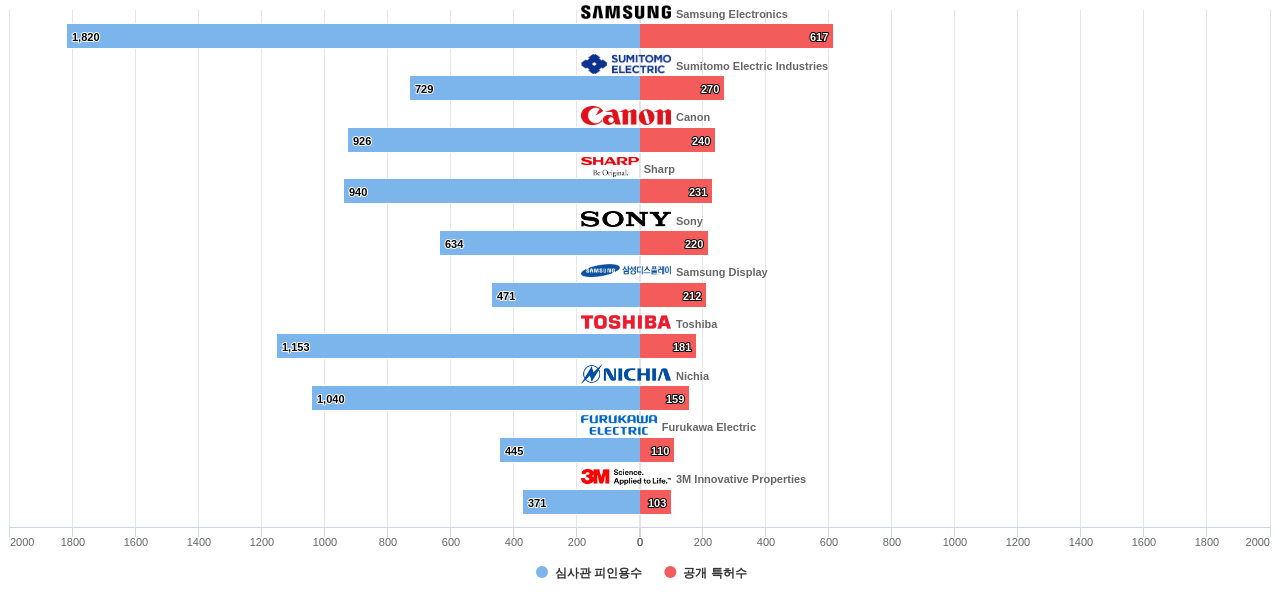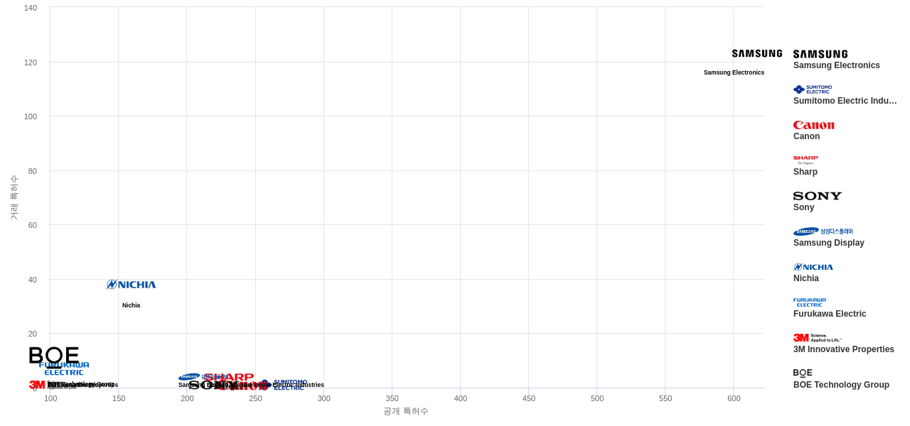 또한 Samsung Electronics는 공개 특허수(617건), 등록 특허수(468건), 공개 특허수 점유율(점유율_공개)(4.54%), 매입 특허수(123건), 심판 특허수(1건), 심사관 피인용수(1,820회), 심사관 피인용수 점유율(점유율_FC-E)(5.17%), 해외 특허 패밀리수(해외 Fam.)(1,110개), Nichia는 집중률(4.29%), 소송 특허수(6건)에서 1위 입니다. Sumitomo Electric Industries는 공개 특허수(270건), 등록 특허수(225건), 공개 특허수 점유율(점유율_공개)(1.99%), 해외 특허 패밀리수(해외 Fam.)(792개), Furukawa Electric은 집중률(2.84%), Toshiba는 심사관 피인용수(1,153회), 심사관 피인용수 점유율(점유율_FC-E)(3.27%)에서 2위 입니다. Canon은 공개 특허수(240건), 등록 특허수(207건), 공개 특허수 점유율(점유율_공개)(1.77%), 소송 특허수(1건)에서 3위 입니다. Sharp는 공개 특허수(231건), 공개 특허수 점유율(점유율_공개)(1.7%), 집중률(0.67%), 심사관 피인용수(940회), 심사관 피인용수 점유율(점유율_FC-E)(2.67%), Sony는 등록 특허수(184건), Samsung Display는 매입 특허수(4건)에서 4위 입니다.