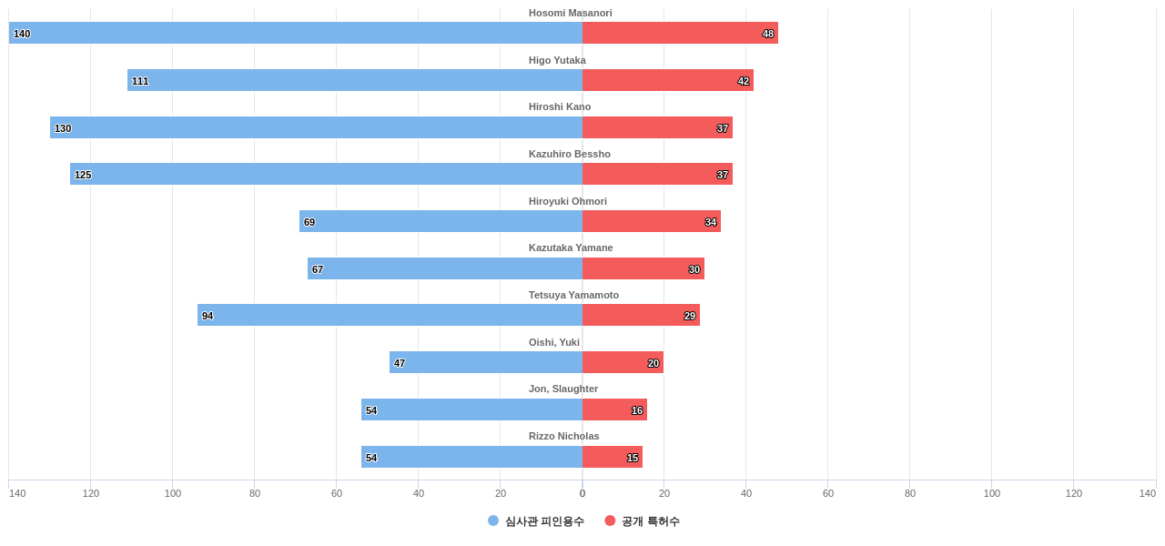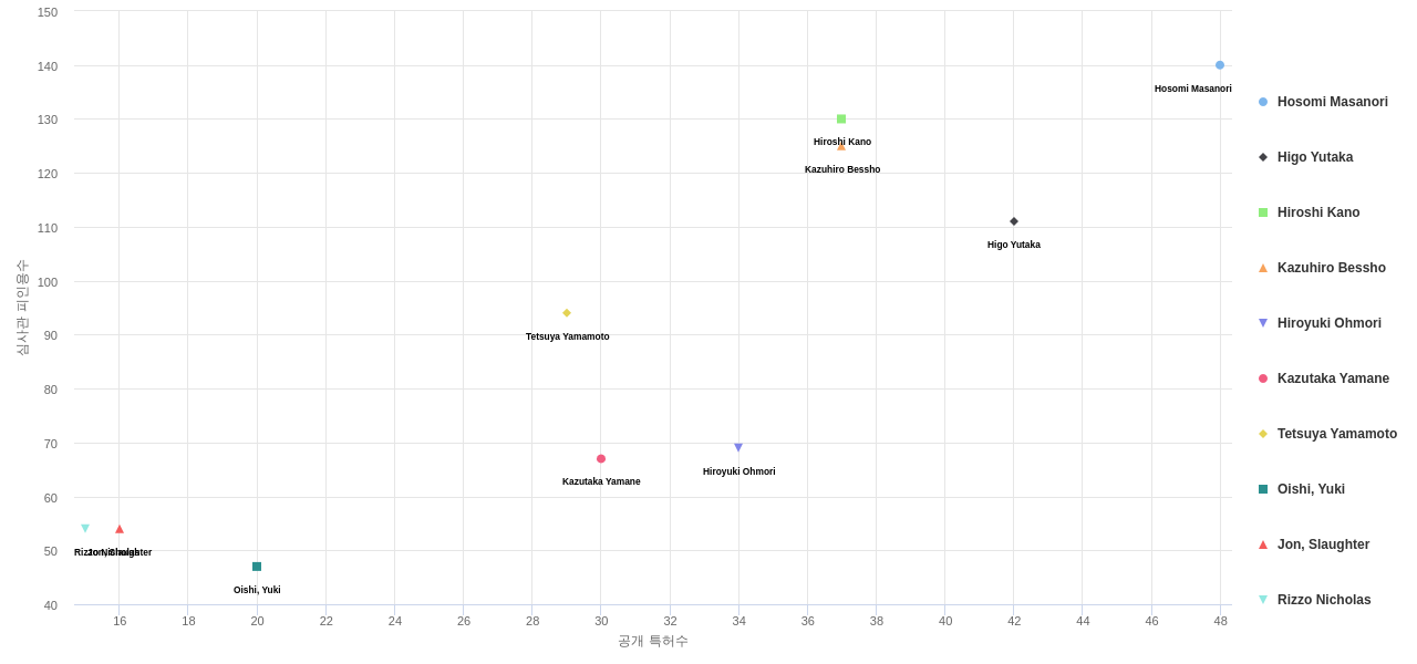 또한 Hosomi Masanori는 발명 특허수(공개 특허수)(48건), 등록 특허수(45건), 공개 특허수 점유율(점유율_공개)(0.76%), 거래 특허수(1건), 심사관 피인용수(140회), 심사관 피인용수 점유율(점유율_FC-E)(0.86%), 해외 특허 패밀리수(해외 Fam.)(63개), Hiroshi Kano는 집중률(56.1%)에서 1위 입니다. Higo Yutaka는 발명 특허수(공개 특허수)(42건), 등록 특허수(39건), 공개 특허수 점유율(점유율_공개)(0.66%), 거래 특허수(1건), Tetsuya Yamamoto는 집중률(51.8%)에서 2위 입니다. Kazuhiro Bessho는 등록 특허수(36건), 심사관 피인용수(125회), 심사관 피인용수 점유율(점유율_FC-E)(0.77%), Oishi, Yuki는 집중률(43.5%)에서 3위 입니다. Rizzo Nicholas는 집중률(39.5%)에서 4위 입니다. Hiroyuki Ohmori는 발명 특허수(공개 특허수)(34건), 등록 특허수(32건), 공개 특허수 점유율(점유율_공개)(0.54%)에서 5위 입니다.