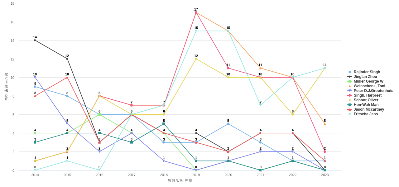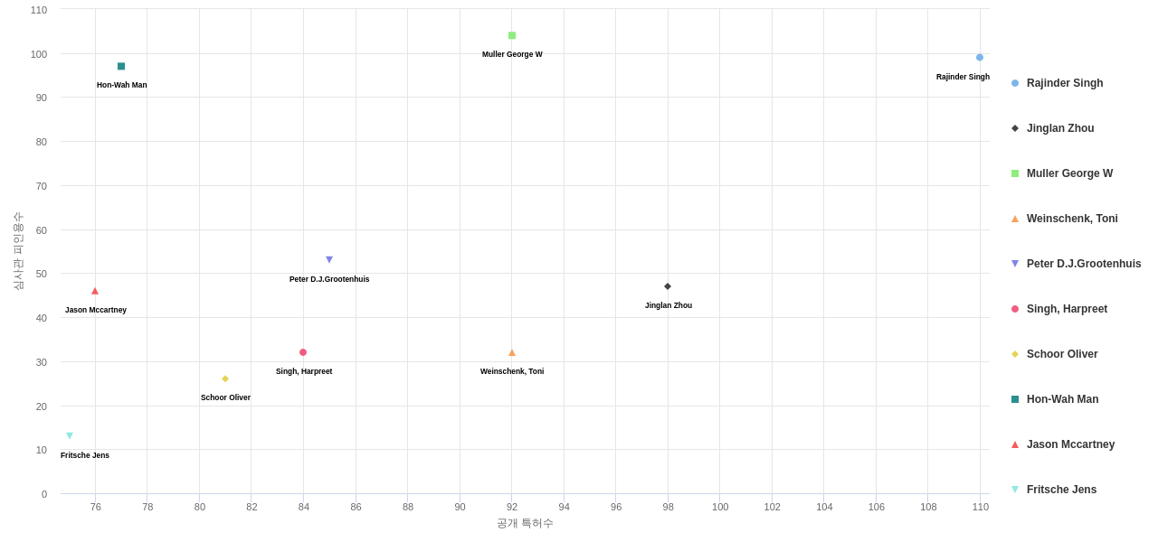 또한 Rajinder Singh은 발명 특허수(공개 특허수)(110건), 등록 특허수(106건), 공개 특허수 점유율(점유율_공개)(0.22%), Peter D.J.Grootenhuis는 집중률(91.4%), Muller George W는 거래 특허수(25건), 소송 특허수(5건), 심사관 피인용수(104회), 심사관 피인용수 점유율(점유율_FC-E)(0.36%), 해외 특허 패밀리수(해외 Fam.)(834개)에서 1위 입니다. Jinglan Zhou는 발명 특허수(공개 특허수)(98건), 공개 특허수 점유율(점유율_공개)(0.2%), 해외 특허 패밀리수(해외 Fam.)(709개), Jason Mccartney는 집중률(86.4%), Hon-Wah Man은 거래 특허수(25건), 소송 특허수(5건)에서 2위 입니다. Weinschenk, Toni는 등록 특허수(79건)에서 3위 입니다. Singh, Harpreet는 등록 특허수(74건)에서 5위 입니다.
