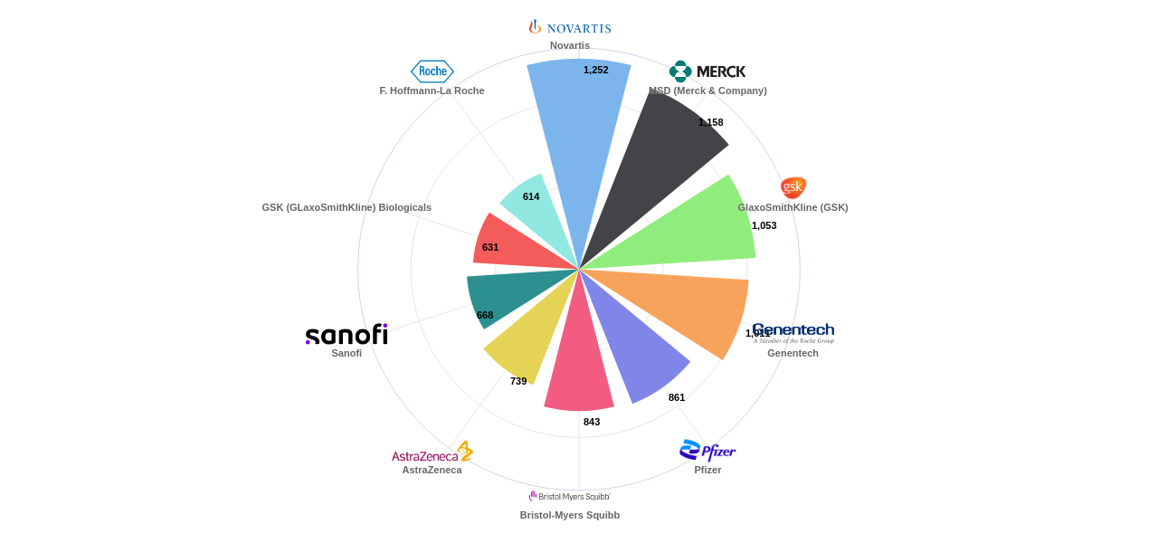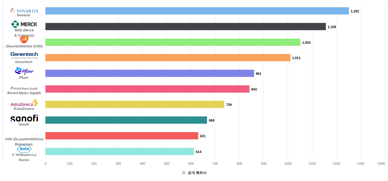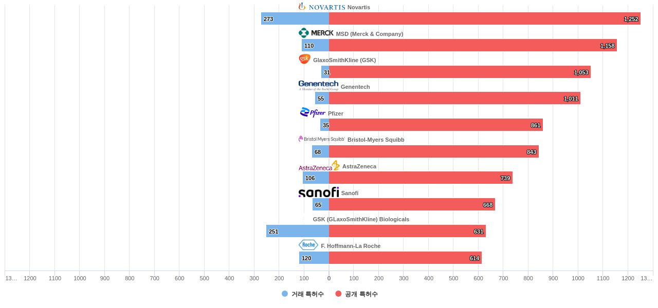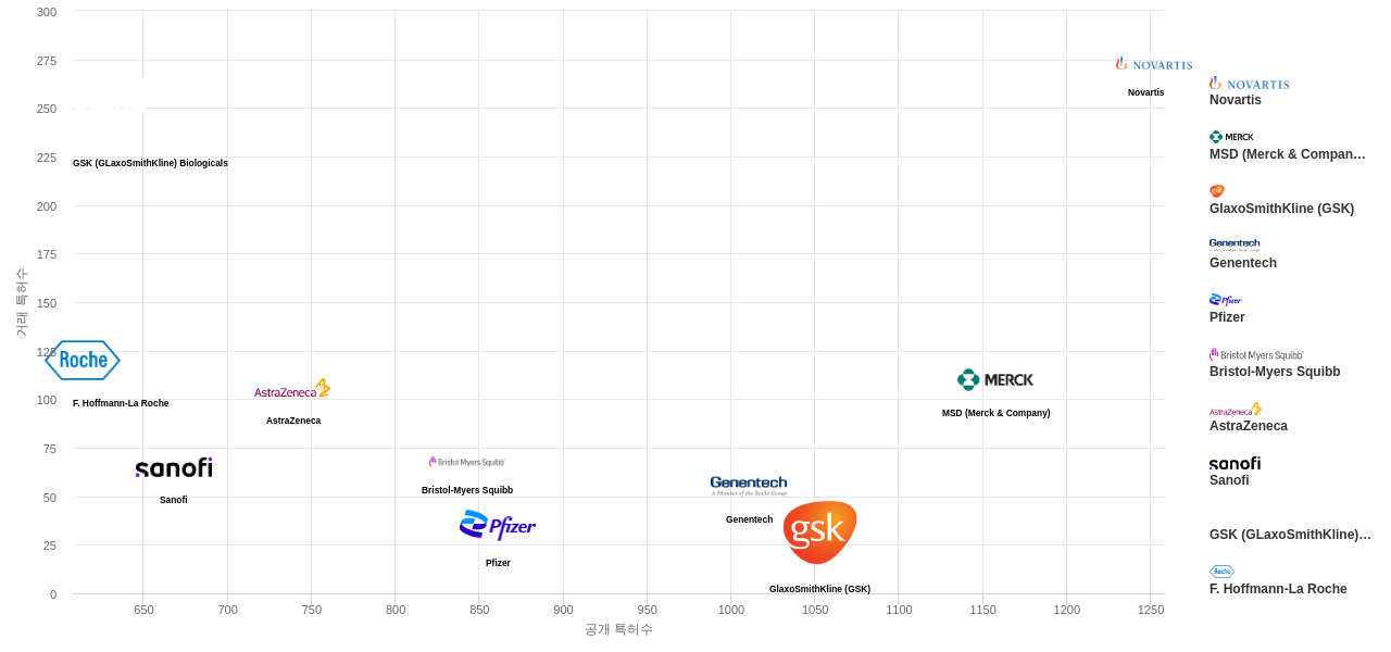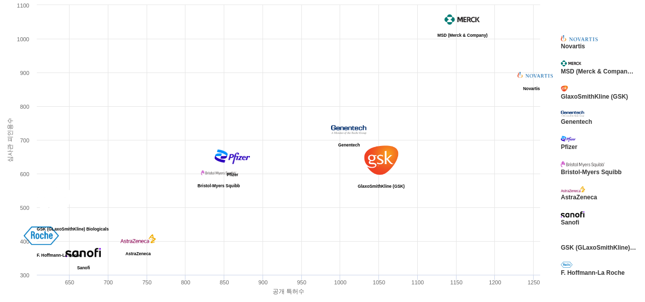 또한 Novartis는 공개 특허수(1,252건), 공개 특허수 점유율(점유율_공개)(1.57%), 매입 특허수(273건), 소송 특허수(22건), 해외 특허 패밀리수(해외 Fam.)(14,635개), MSD (Merck & Company)은(는) 등록 특허수(883건), 심사관 피인용수(1,057회), 심사관 피인용수 점유율(점유율_FC-E)(2.35%), GSK (GLaxoSmithKline) Biologicals는 집중률(49.2%), Genentech은 심판 특허수(7건)에서 1위 입니다. F. Hoffmann-La Roche는 심판 특허수(6건), Pfizer는 해외 특허 패밀리수(해외 Fam.)(10,858개)에서 2위 입니다. GlaxoSmithKline (GSK)은(는) 공개 특허수(1,053건), 등록 특허수(714건), 공개 특허수 점유율(점유율_공개)(1.32%), Sanofi는 해외 특허 패밀리수(해외 Fam.)(9,359개)에서 3위 입니다. Bristol-Myers Squibb는 등록 특허수(678건), 심판 특허수(1건), AstraZeneca는 집중률(15.4%), 소송 특허수(7건)에서 4위 입니다.