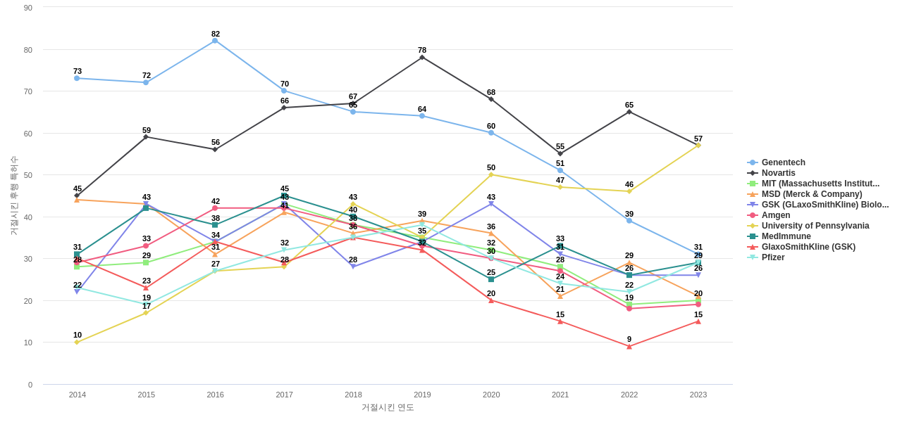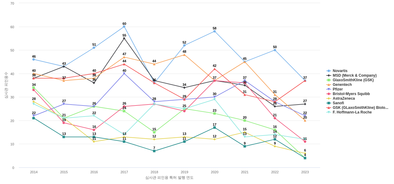 이 분야의 주요 핵심 기업에는 1위 Novartis, 2위 MSD (Merck & Company), 3위 GlaxoSmithKline (GSK) 등이 있습니다.